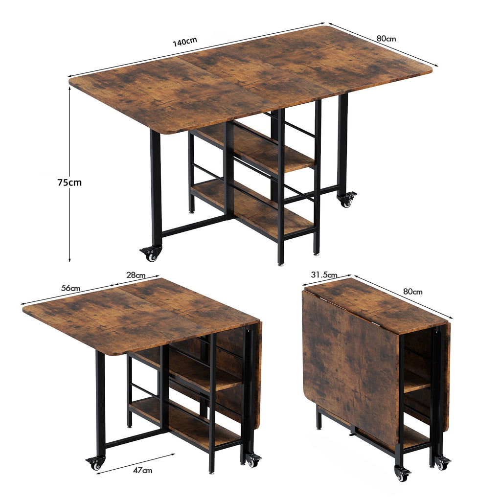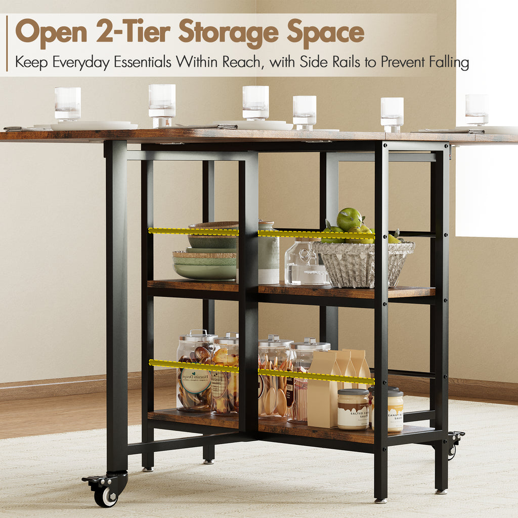 Whether fully expanded for family meals or folded into a compact console, it adapts effortlessly to your lifestyle and living space. The built-in shelves provide easy-access storage, while the sturdy metal frame, silicone buffers, and locking wheels ensure stability and durability.