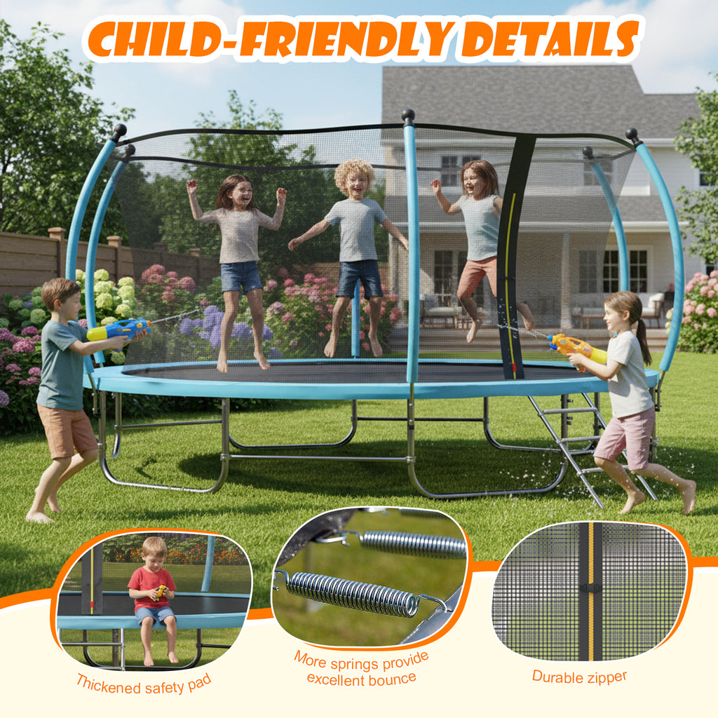 • Thoughtful Details: The 14FT trampoline is equipped with a two-way buckle, which can be easily opened inside and outside, making it convenient for children to enter and exit. It is also equipped with a thickened assembly ladder, which is safe and convenient. The floor area of 427*427 cm is very suitable for outdoor or home garden use.
