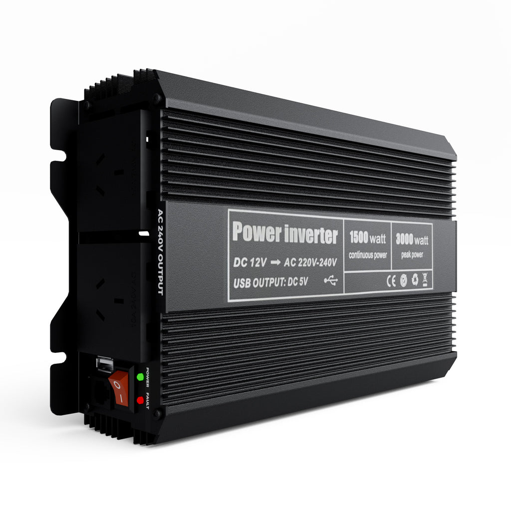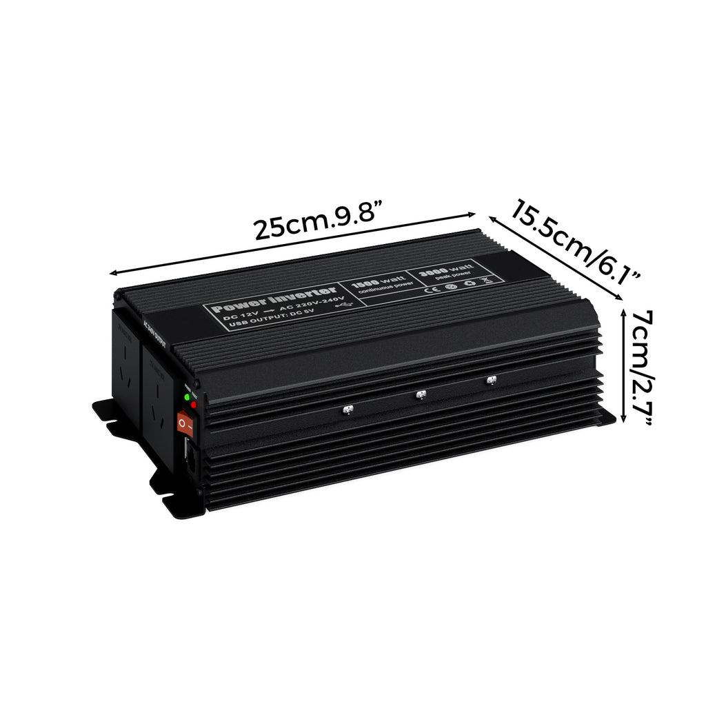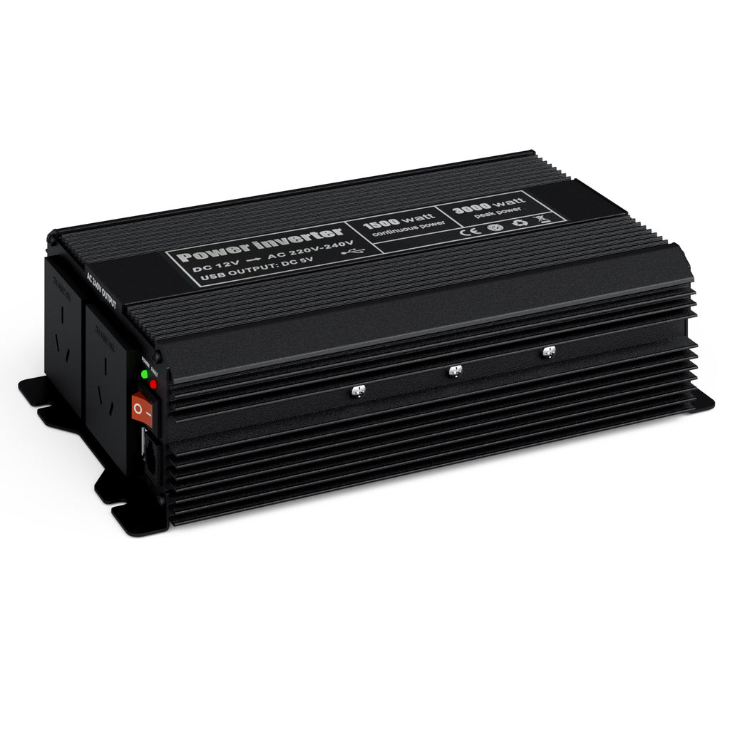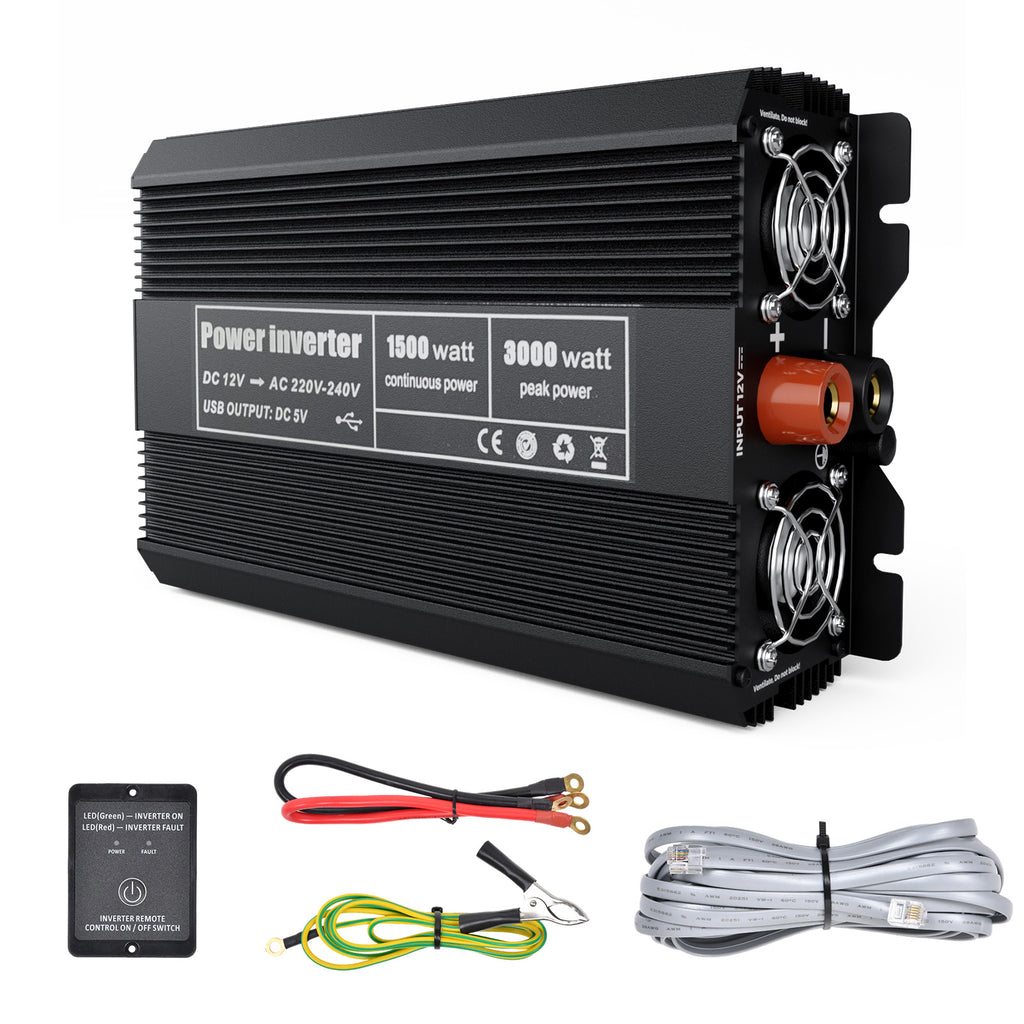 This high-performance power inverter has a 12V DC input, 220-240V AC output, a rated power of 1500W, a peak power of 3000W, and a conversion efficiency of over 85%. It is equipped with a temperature controlled intelligent fan that automatically adjusts with temperature and has five protection functions: overload, overvoltage, overheating, low voltage, and short circuit. It is compatible with various scenarios such as car, outdoor, and emergency situations, and has full practicality.