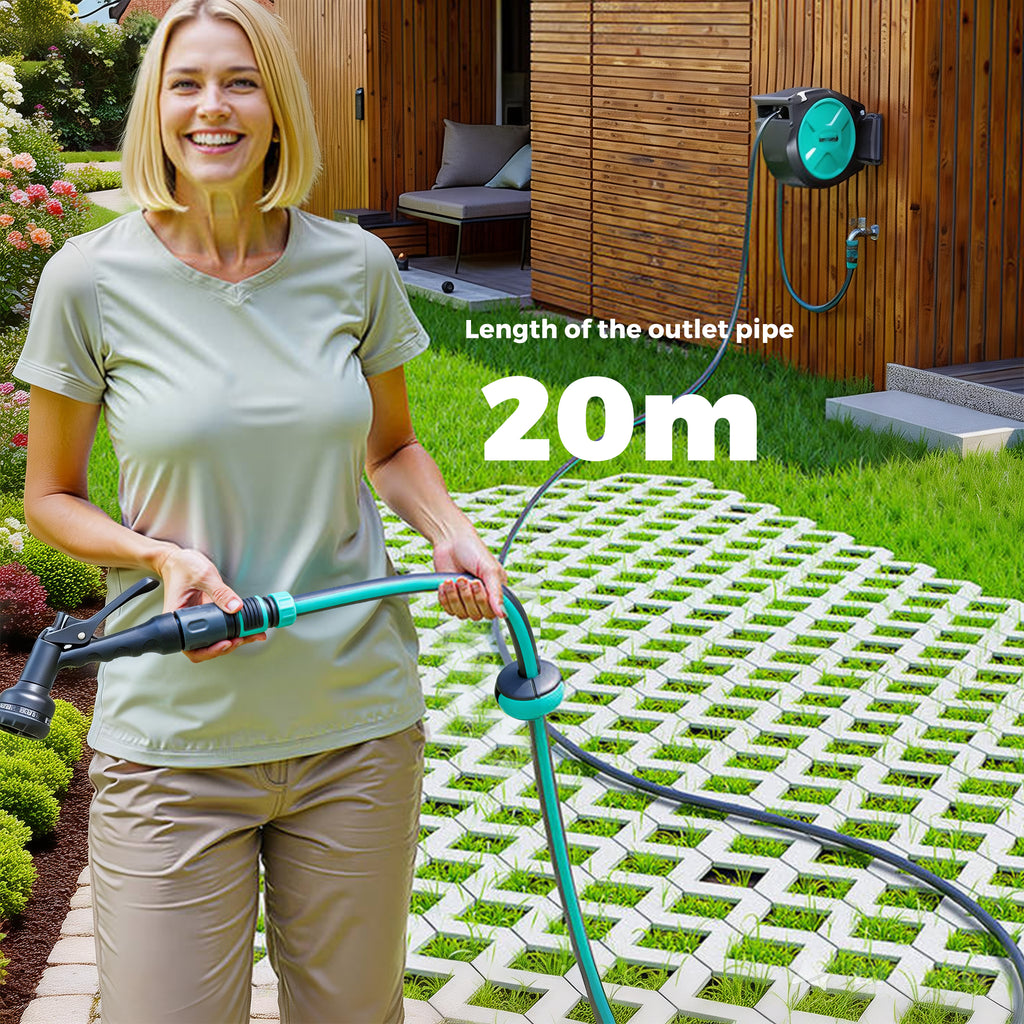 Lockable Hose Length: Equipped with a 20m hose, the garden reel allows you to lock the hose at any desired length. Simply lift the handle to release and retract, making it easy to cover every corner of your garden, lawn, or driveway.