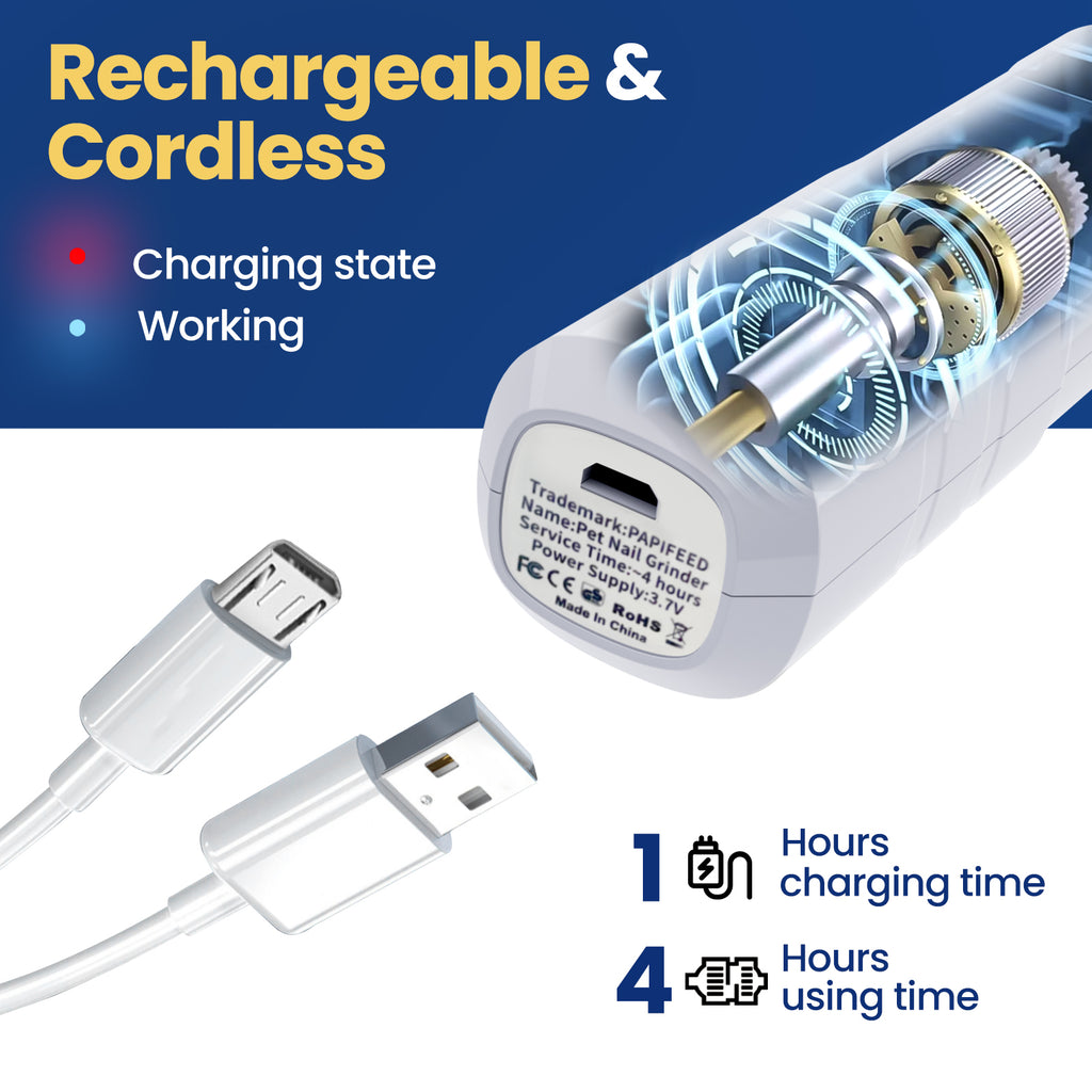 - Rechargeable & Portable: The cordless dog grinder is rechargeable and has an indicator light on the bottom that turns on red light when charging. Each grinder has a built-in battery that lasts 4 hour after a hour charge. The lightweight and ergonomic body design also makes it easier to handle in your right or left hand.