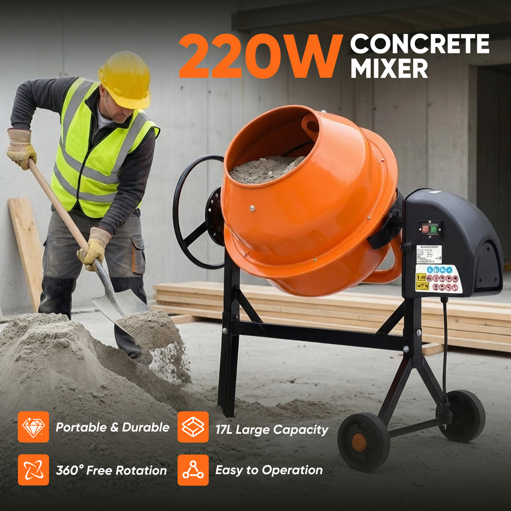 Strong and Efficient Stirring: Equipped with a 220W high-power drive, the concrete mixer can achieve a mixing speed of 28-32RPM, efficiently stirring the concrete raw materials and quickly achieving uniform mixing, suitable for home decoration construction and other scenarios.