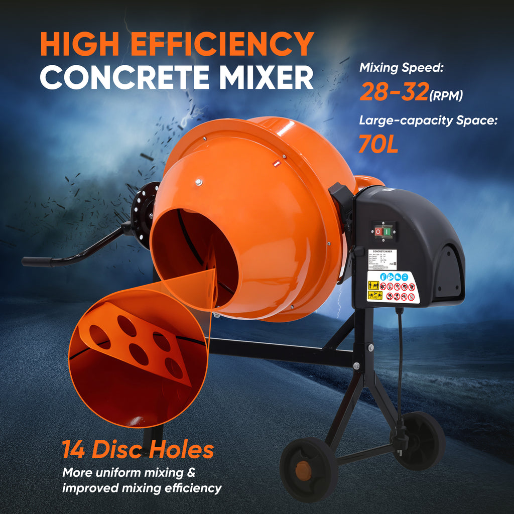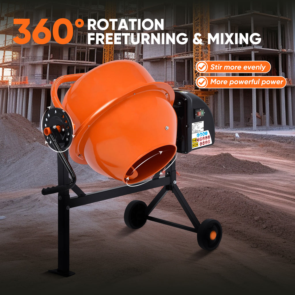 360-degree Rotation: This cement mixer features a spring-loaded tilting disc wheel that allows for free rotation and 360-degree mixing, ensuring even mixing of concrete, mortar, and other materials, preventing clumping, and meeting the needs of home renovation projects while effectively saving time and effort.