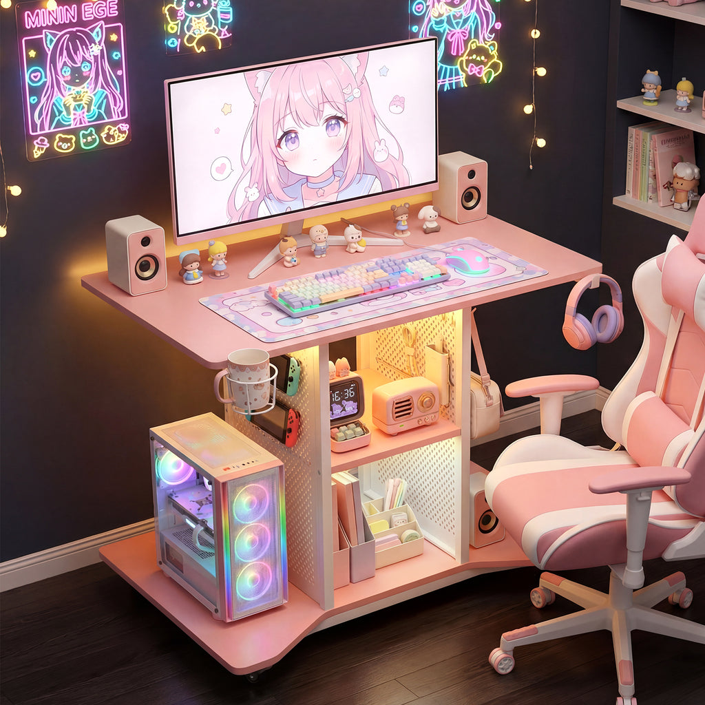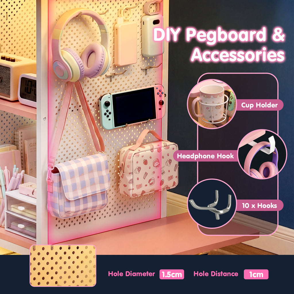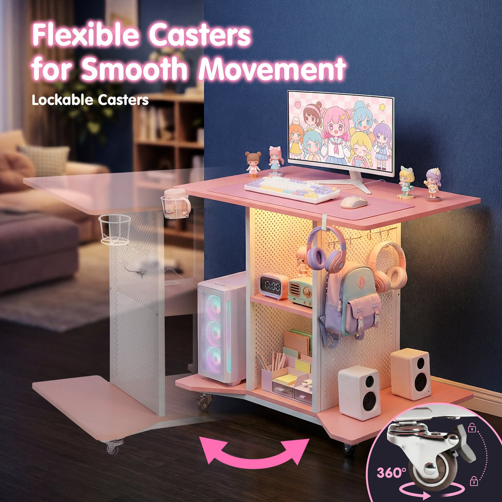 Introducing the ultimate gaming and productivity hub: rolling computer desk equipped with LED lighting, power outlets and 2 pegboards. This versatile desk seamlessly blends modern aesthetics with practical functionality.