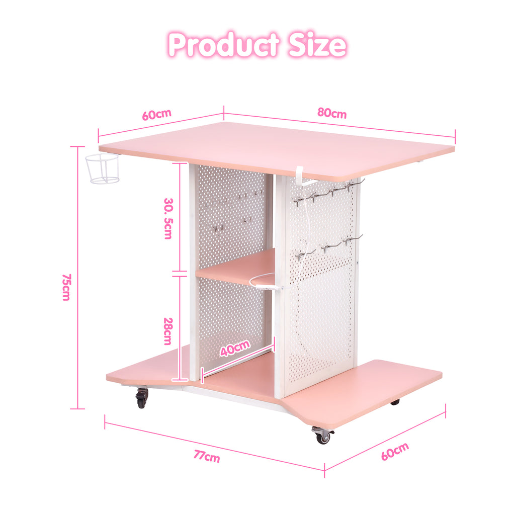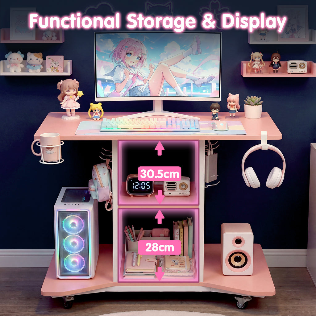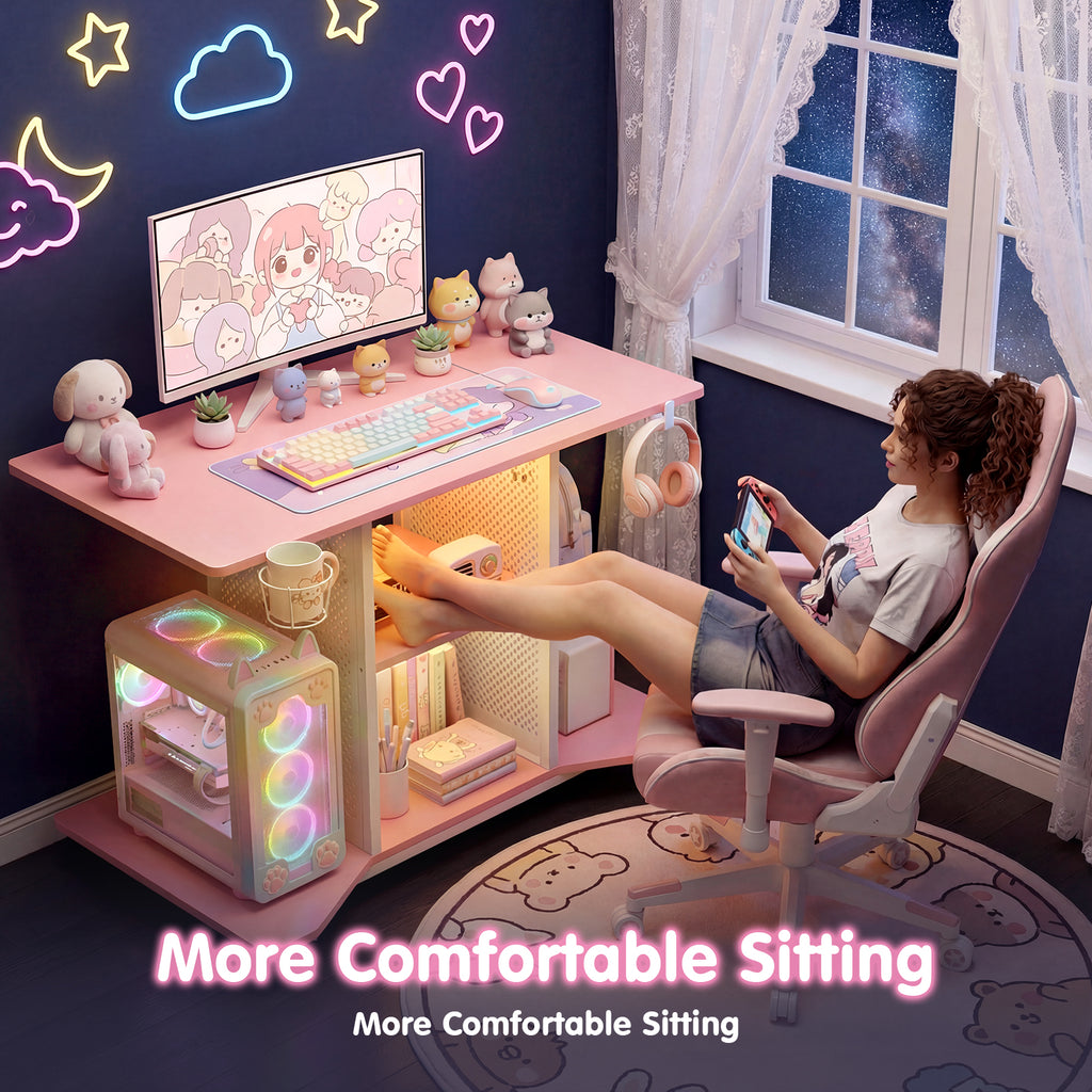 Introducing the ultimate gaming and productivity hub: rolling computer desk equipped with LED lighting, power outlets and 2 pegboards. This versatile desk seamlessly blends modern aesthetics with practical functionality.