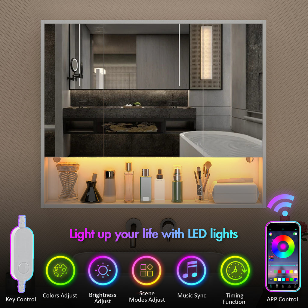 - Smart LED Lighting: Equipped with built-in RGB LED lighting and customizable lighting schedules, this cabinet helps you quickly and easily locate personal care items and medications. Control it with a single button or via the app—choose from 60,000 colors and various lighting modes to suit your mood and lifestyle. With rhythm and timer functions, the adjustable LEDs add a stunning visual accent to your daily routine.