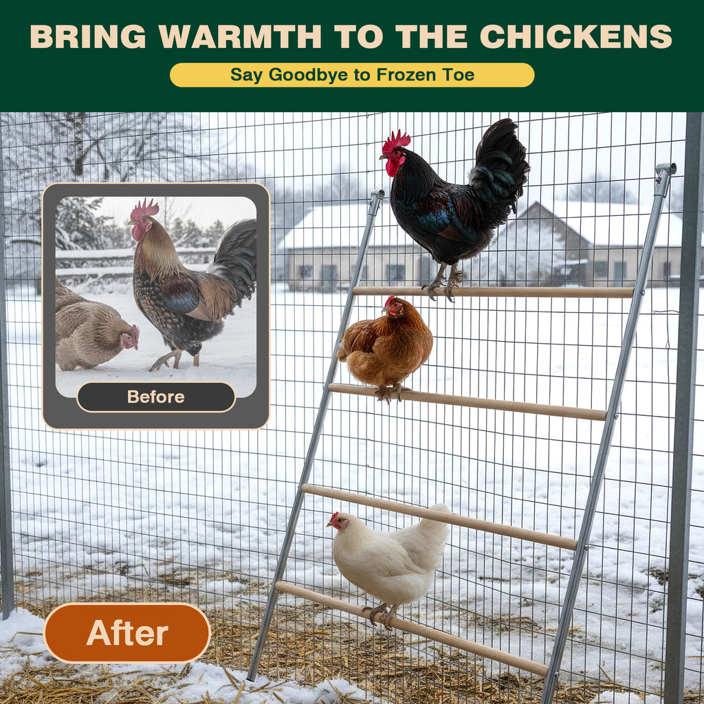 • Sturdy and Durable: The wood has been sanded smooth, with no splinters on the surface, to protect the chickens’ feet. The joint in the middle of the crossbar uses a spiral connection, which can perfectly support the weight of an adult, so there is no need to worry about load-bearing issues. Zero wobble, even with rowdy roosters.