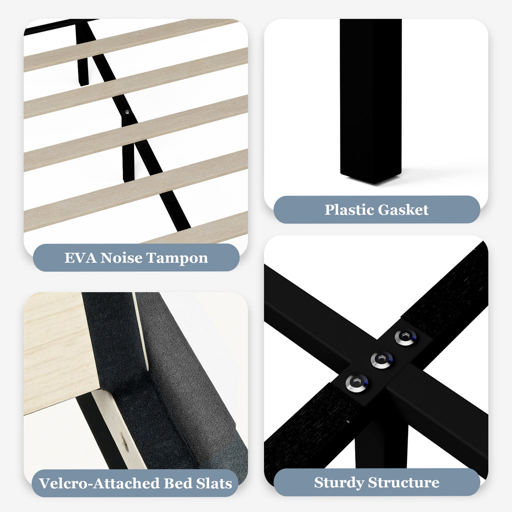 The bed frame is constructed with a metal frame and solid wood strips, and its maximum capacity is 300 kg, ensuring a stable and safe sleeping environment. The embedded mattress base is designed to fit standard Australian mattresses and features an anti-slip design to keep your mattress in place.There is no noise.