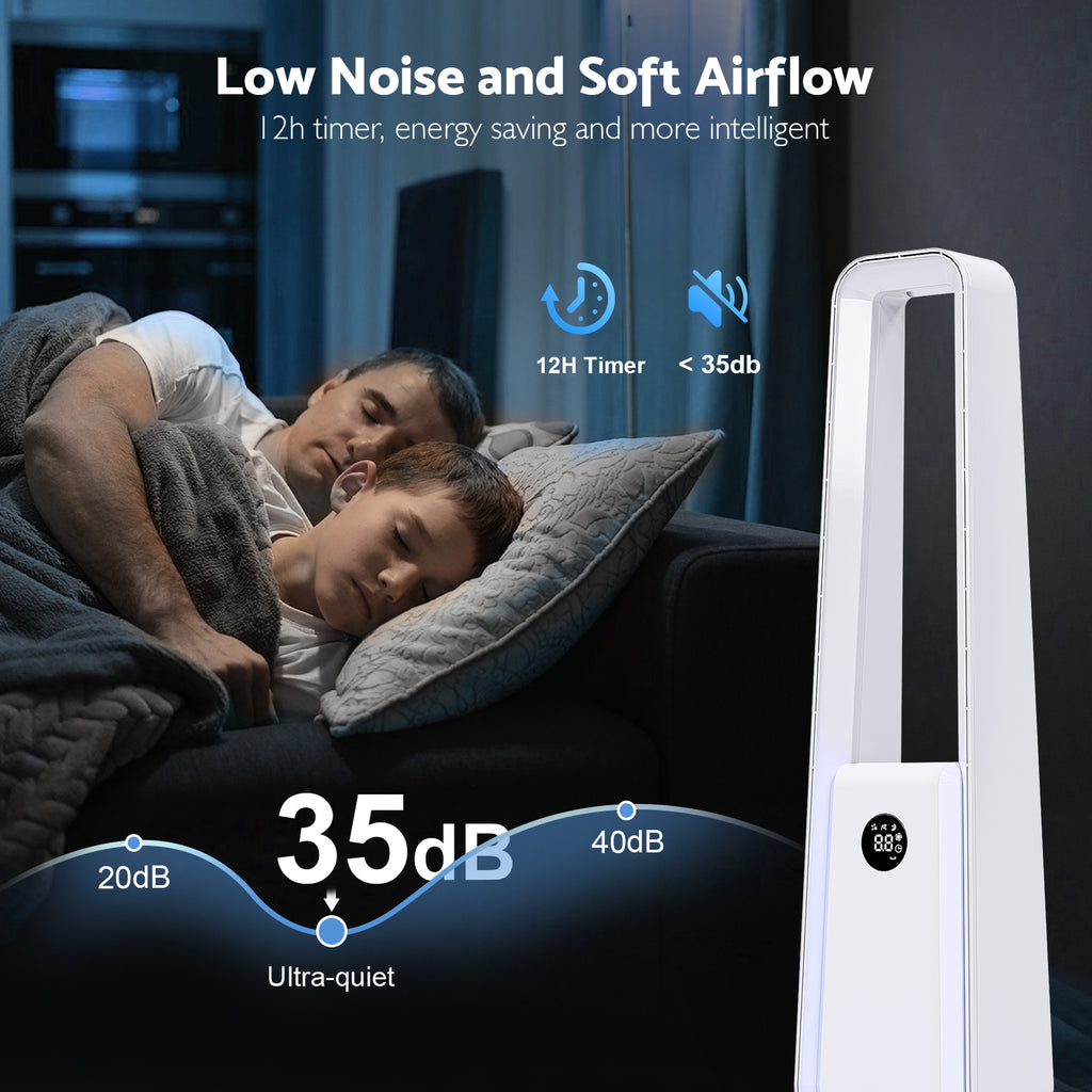 Crafted from high-grade ABS material, its sleek, bladeless architecture ensures a safe and durable addition to any modern home. Customize your environment with three adjustable wind modes—Normal, Natural, and Sleep- supported by three speed settings and 60° wide-angle oscillation for even, whole-room airflow. Enjoy seamless control right from your couch with the included remote or via the intuitive touch panel on the unit itself. The built-in filter works to purify circulating air, while four selectable mood lights let you set the perfect ambiance. Engineered with a quiet, high-efficiency motor and a 12-hour programmable timer, it delivers undisturbed comfort all day and night, making it ideal for both focused relaxation and peaceful sleep.