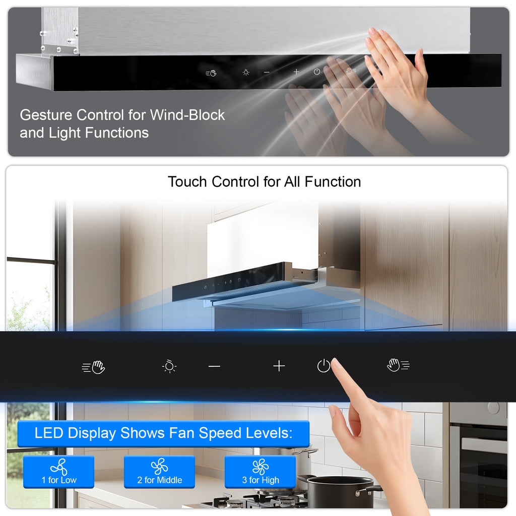 Enjoy cooking without the fuss! The gesture control lets you turn on the light or adjust airflow with just a wave of your hand, while the LED touch panel keeps operation smooth, modern, and easy to clean.