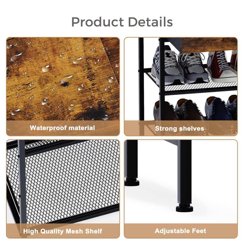Maximize your entryway space with this versatile 4-tier shoe rack. It features two practical fabric drawers for storing small essentials, spacious shelves for a variety of shoes, and a dedicated compartment for boots. Constructed from durable metal and particleboard, it combines sturdiness and reliability with a modern style. Perfect for your entryway, living room, or bedroom, it can organize everything from footwear accessories to books and decorative items. Easy to assemble and featuring an anti-tip safety feature, it’s the perfect addition to your home’s organization.