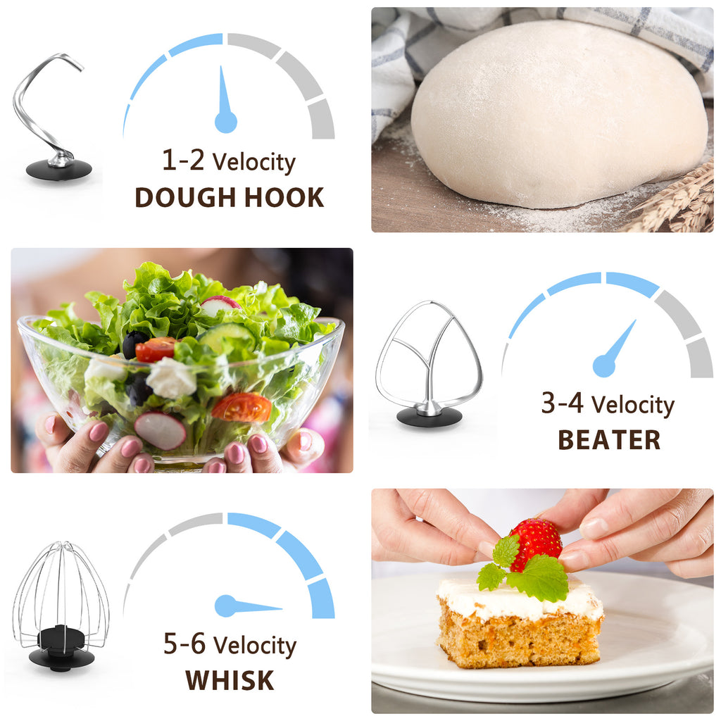 Versatile Attachments for Baking Needs: Includes three essential tools: dough hook for homemade bread, beater for cookie dough and cake batter, and balloon whisk for cream and desserts. All accessories are easy to attach and clean.