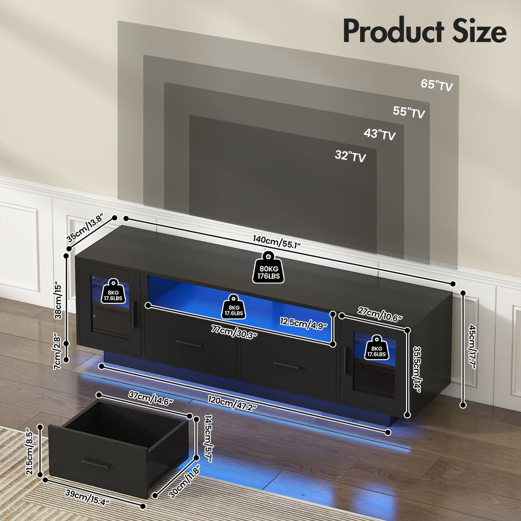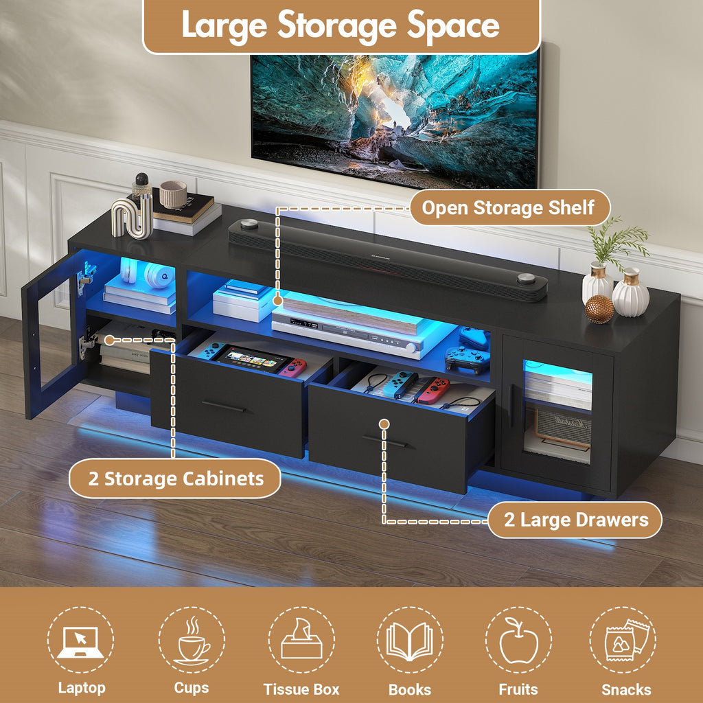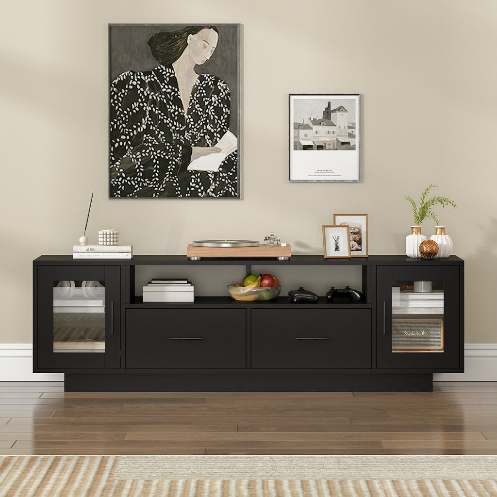 Featuring spacious drawers, a central open shelf, and acrylic side doors, it provides ample storage for consoles, remotes, DVDs, and other items. Crafted from durable particle board, the TV stand unit is stable for long-lasting use.