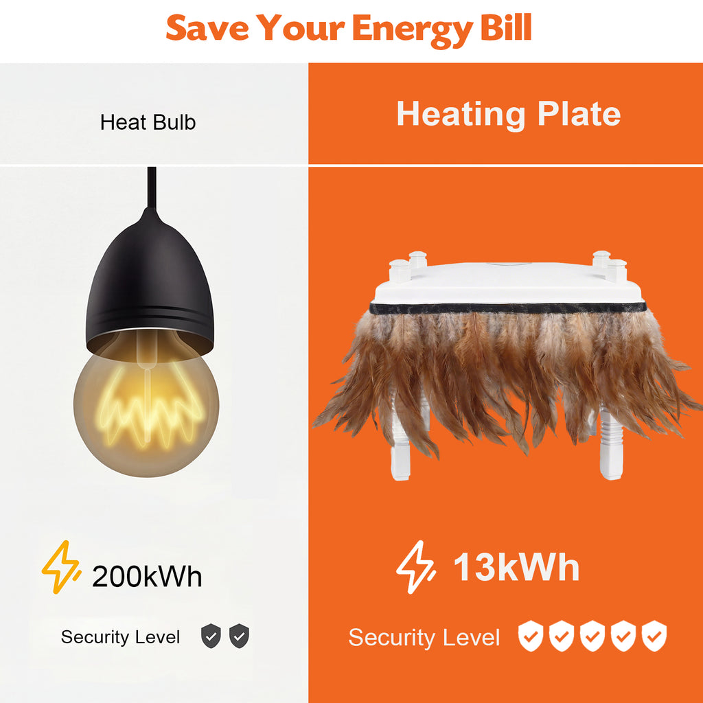 - Safety and Energy Saving: Chicken heat plate consumes only 20 watts/hr. Up to 70% less energy than traditional heat lamps while maintaining optimal temperature. The shell is made of flame retardant material, reducing the risk of burns and fire.