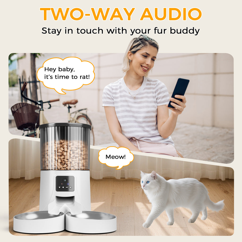 • Two-way Audio & Custom Meal Recording: Automatic pet feeder with advanced built-in microphones and speakers to keep you connected to your pets anytime, anywhere. The automatic cat feeder with camera allows you to record a recording of the feed (up to 10 seconds) and let your pet hear the familiar feed sound. Every feed will play a recording,creating a familiar mealtime experience for your pet.