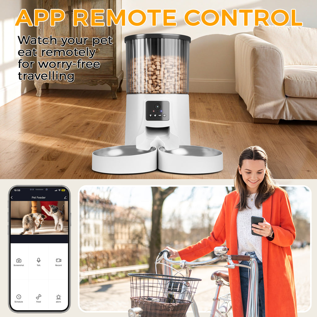 • Double Bowl Design: Automatic cat feeder for multiple cats provides two stainless steel bowls, perfect for feeding two cats at once; ensures organized and easy mealtime management.