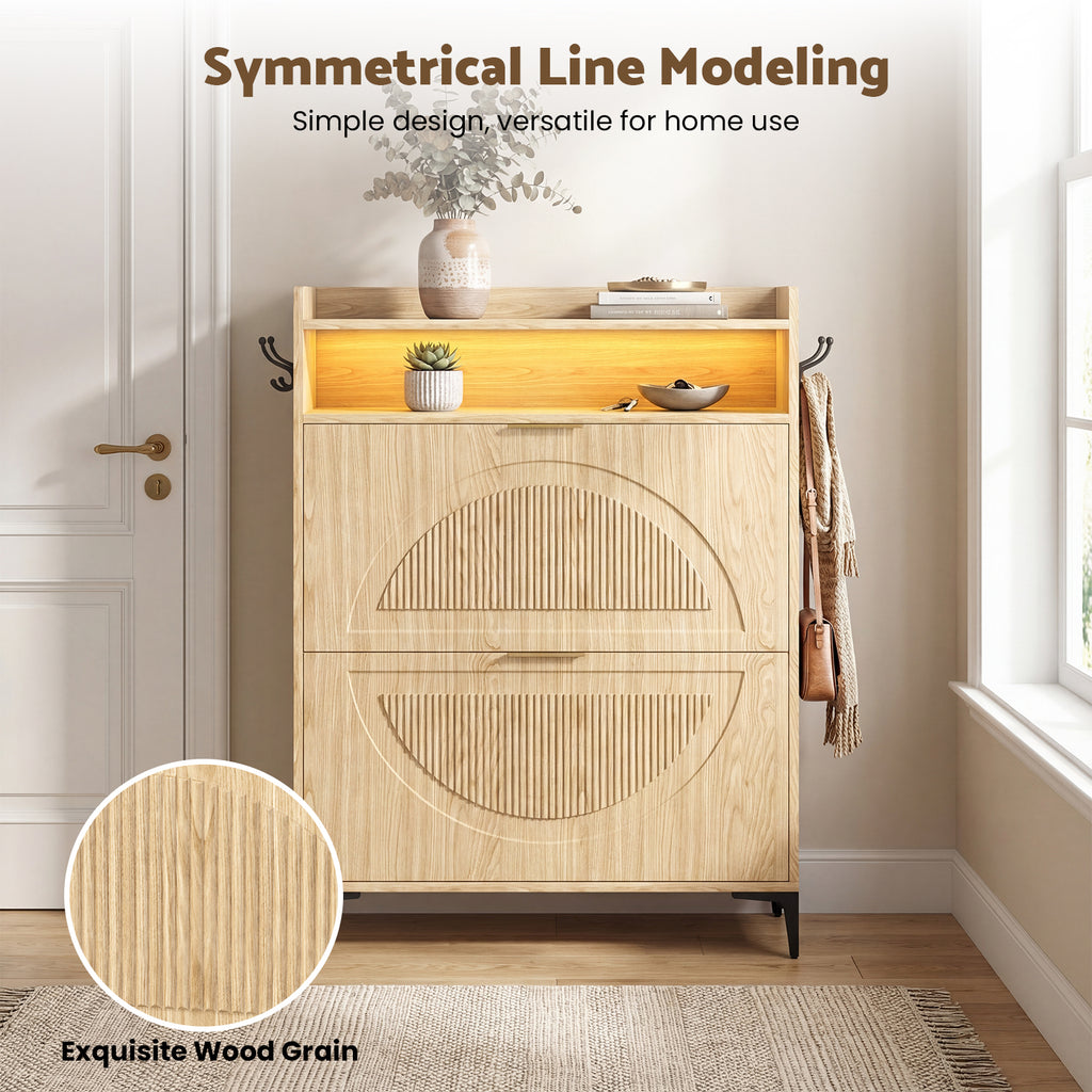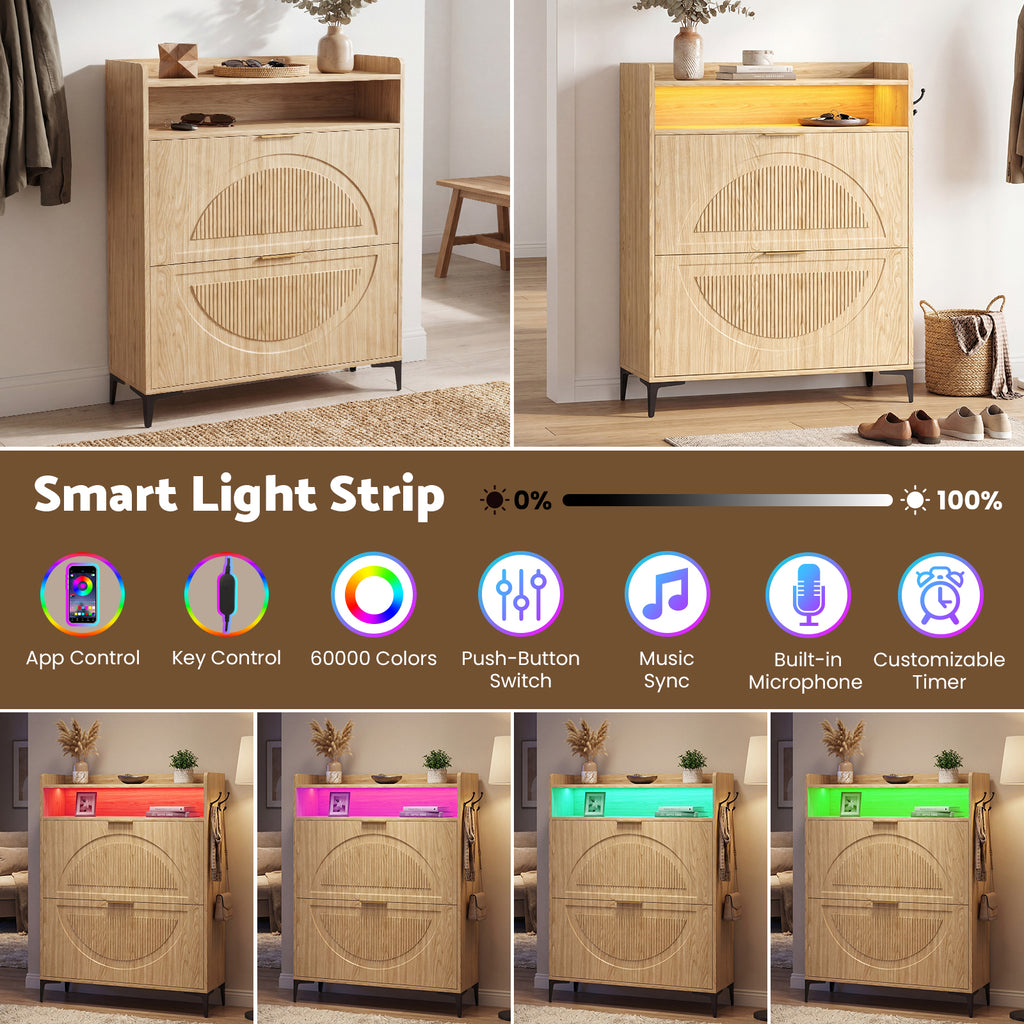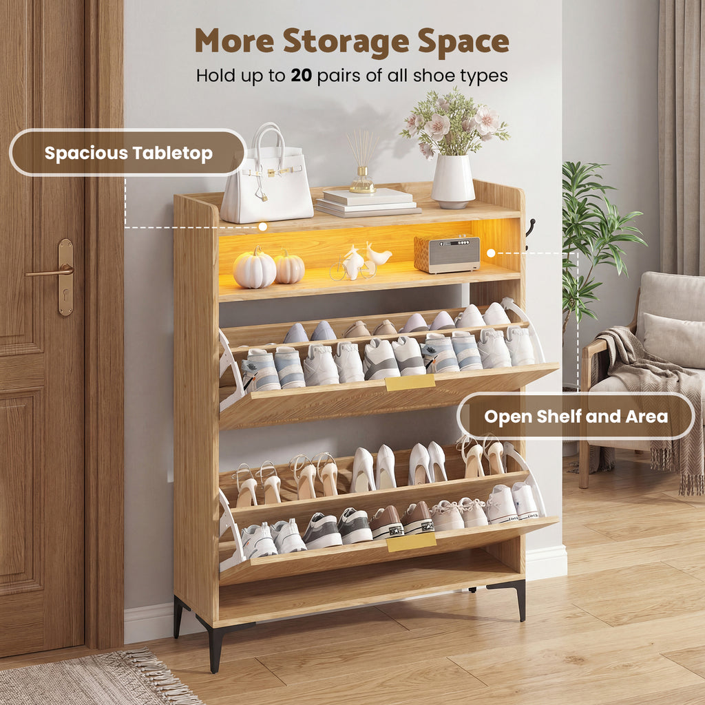 This multifunctional shoe cabinet combines vibrant lighting with smart storage to perfect your entryway. Its standout feature is an open-top shelf with a customizable RGB LED strip, controllable via app or remote for ambiance and late-night convenience.