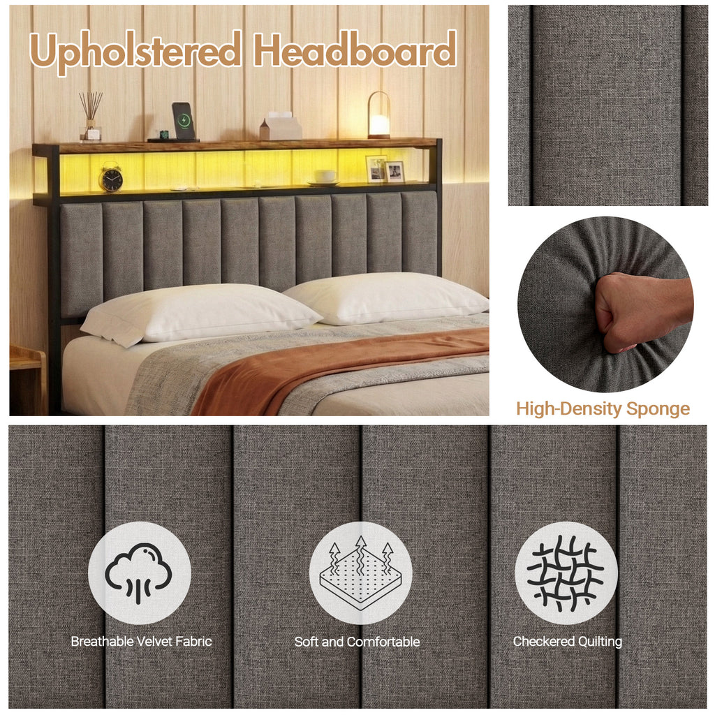 - Upholstered Storage Headboard: 2-tier display shelves at the top of the headboard can hold alarm clocks, etc a small thing. Below is a vertical seam upholstered headboard that provides a comfortable space for your head. The bed head perfectly combines the design concept of practicality and comfort.