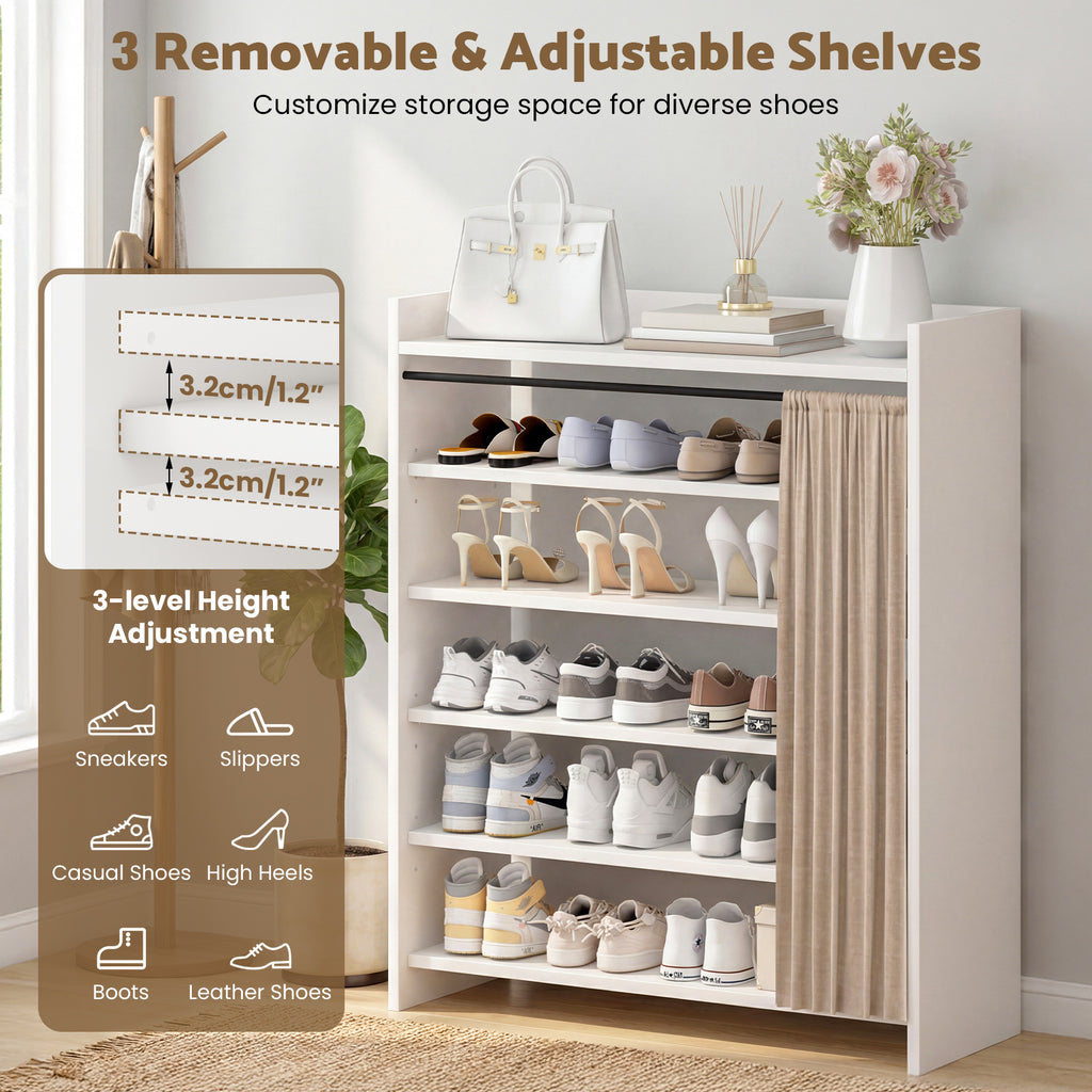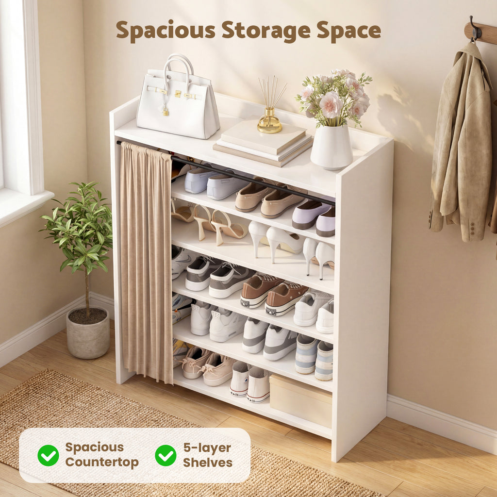 Linen Curtain Design: A minimalist white shoe cabinet paired with beige linen curtains blends seamlessly with various home décor styles. The beige linen curtains replace traditional cabinet doors, creating a warm and comfortable atmosphere. They effectively prevent dust from entering the shoe cabinet while providing a cleaner visual effect. Simply pull back the curtain for easy access to shoes, avoiding noise and hassle.