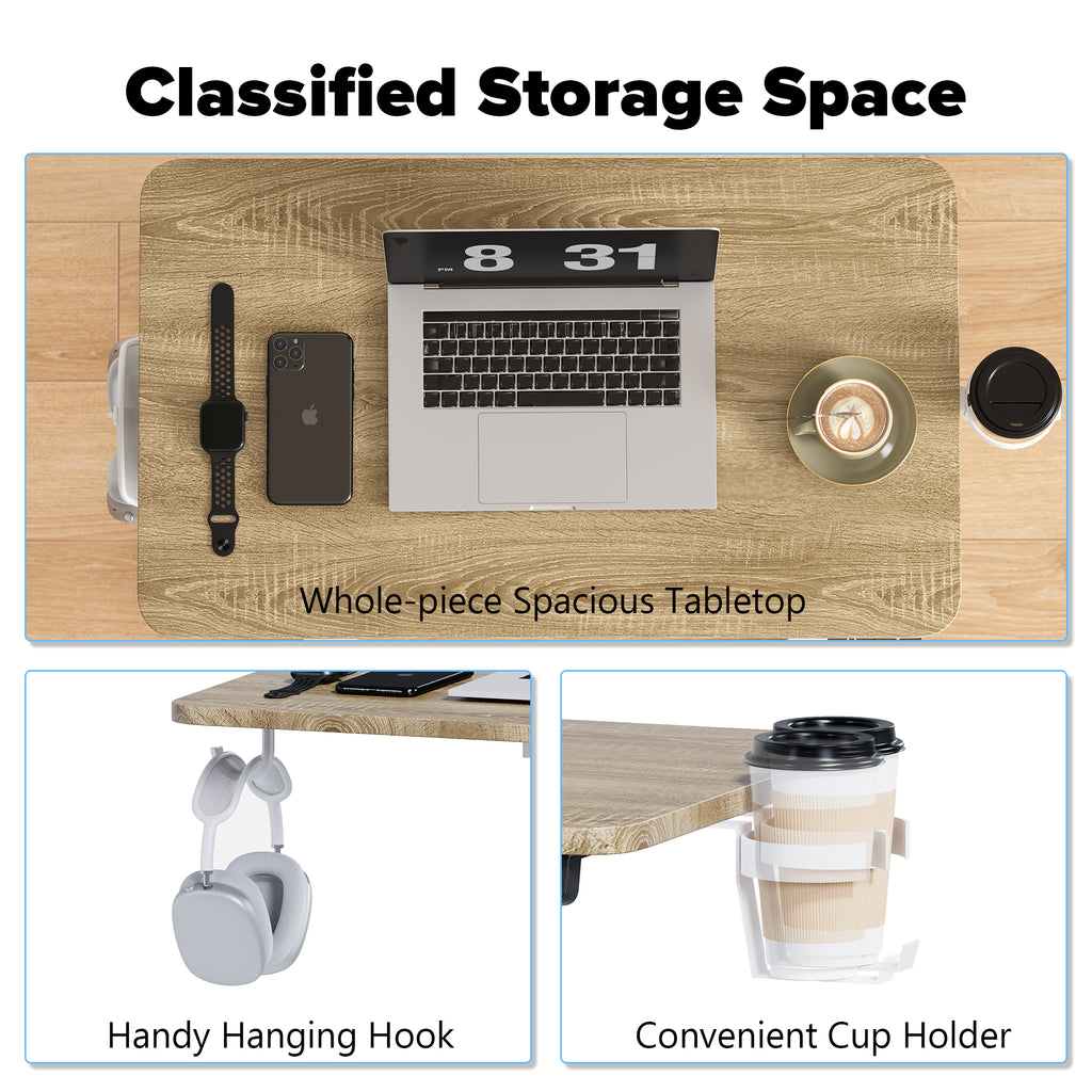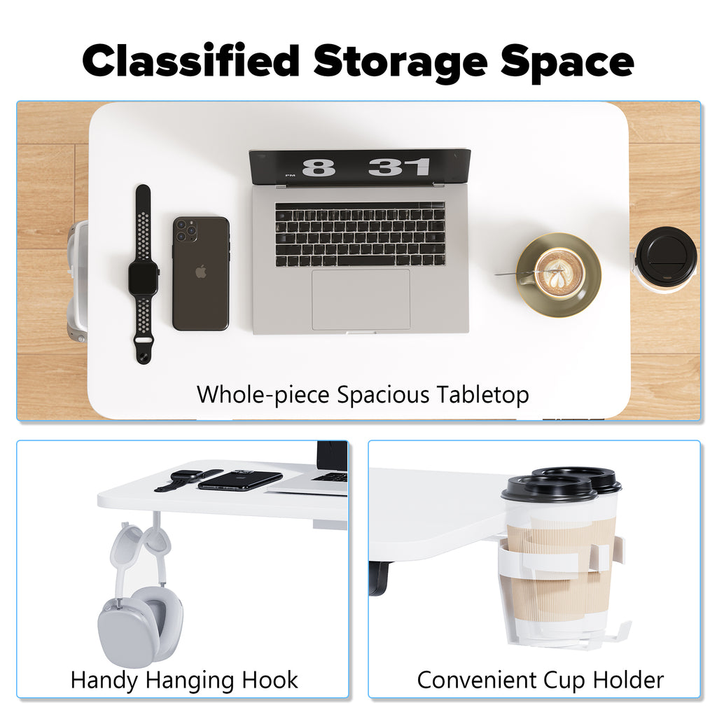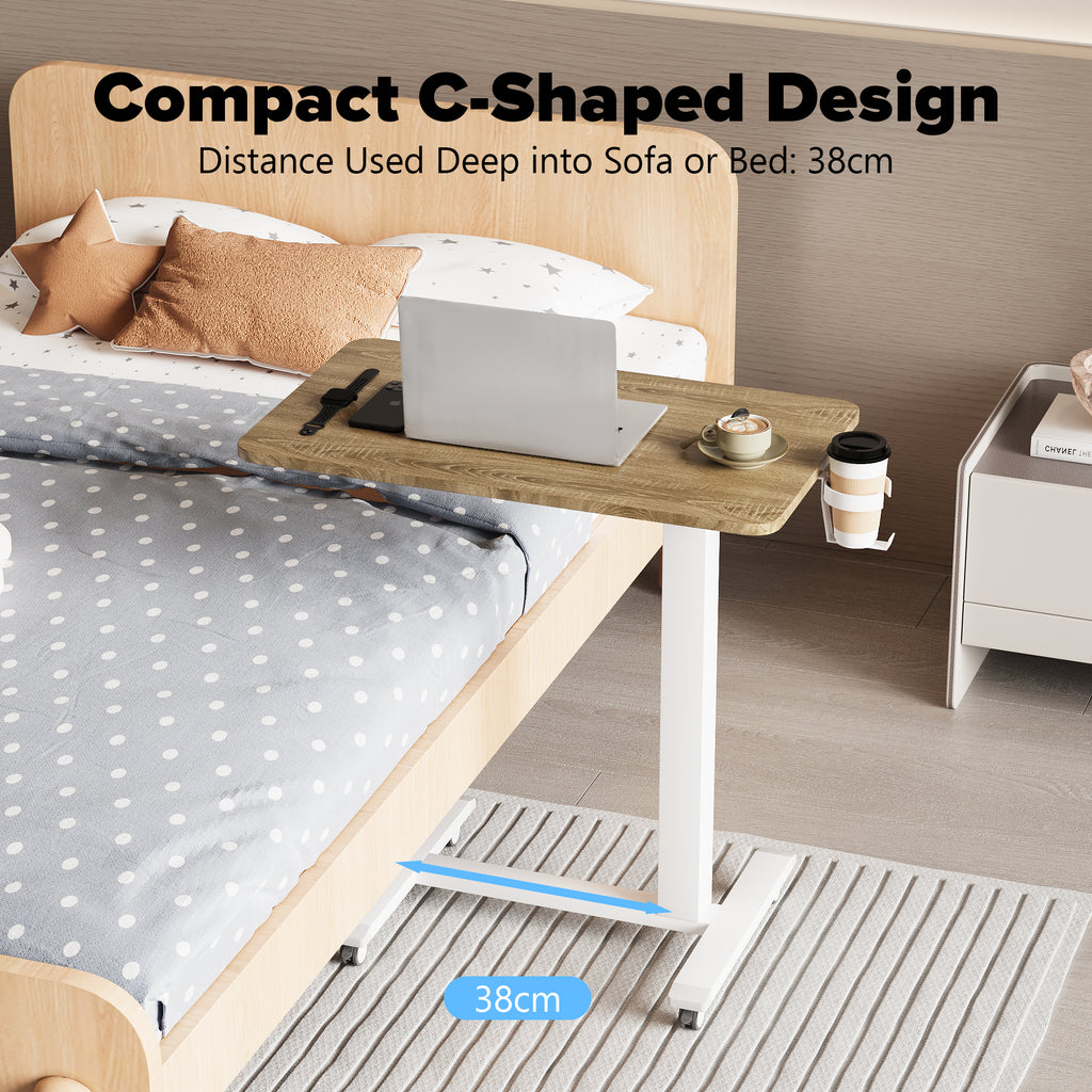 The small sit stand desk features smooth-rolling wheels, and a space-saving C-shaped design that allows for easy mobility between beds and sofas.