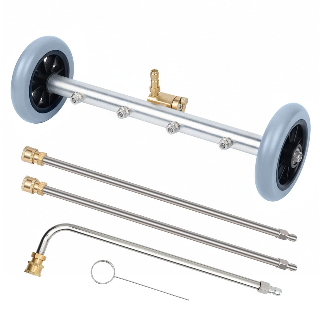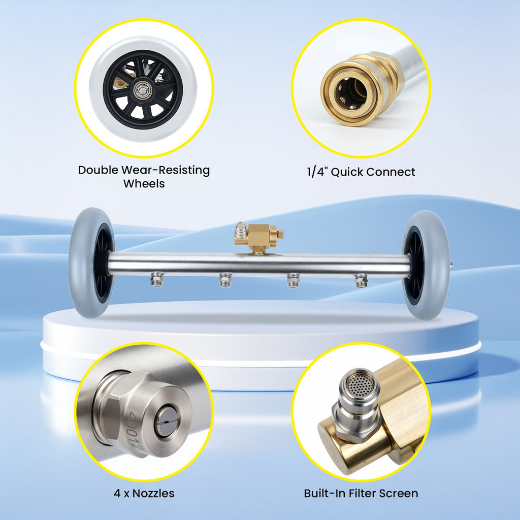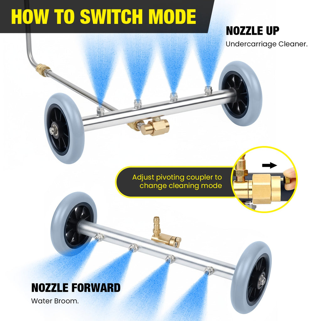Dual-Function: The pressure washer attachment is functions as both an undercarriage cleaner and a high-pressure water broom. Simply adjust the nozzle height to switch between vehicle undercarriage cleaning and driveway surface cleaning, saving time and effort on routine maintenance. Two 360 degree rotating rollers design, easy to push and pull.