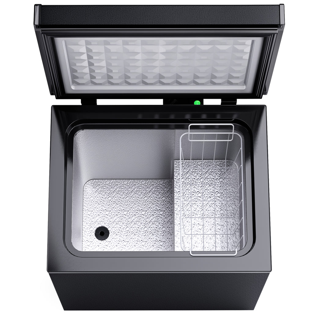 The 50L interior provides ample space for meat, seafood, ice packs, vegetables, ice cream, and beverages. A removable wire basket is included for convenient organization and quick access to frequently used items.