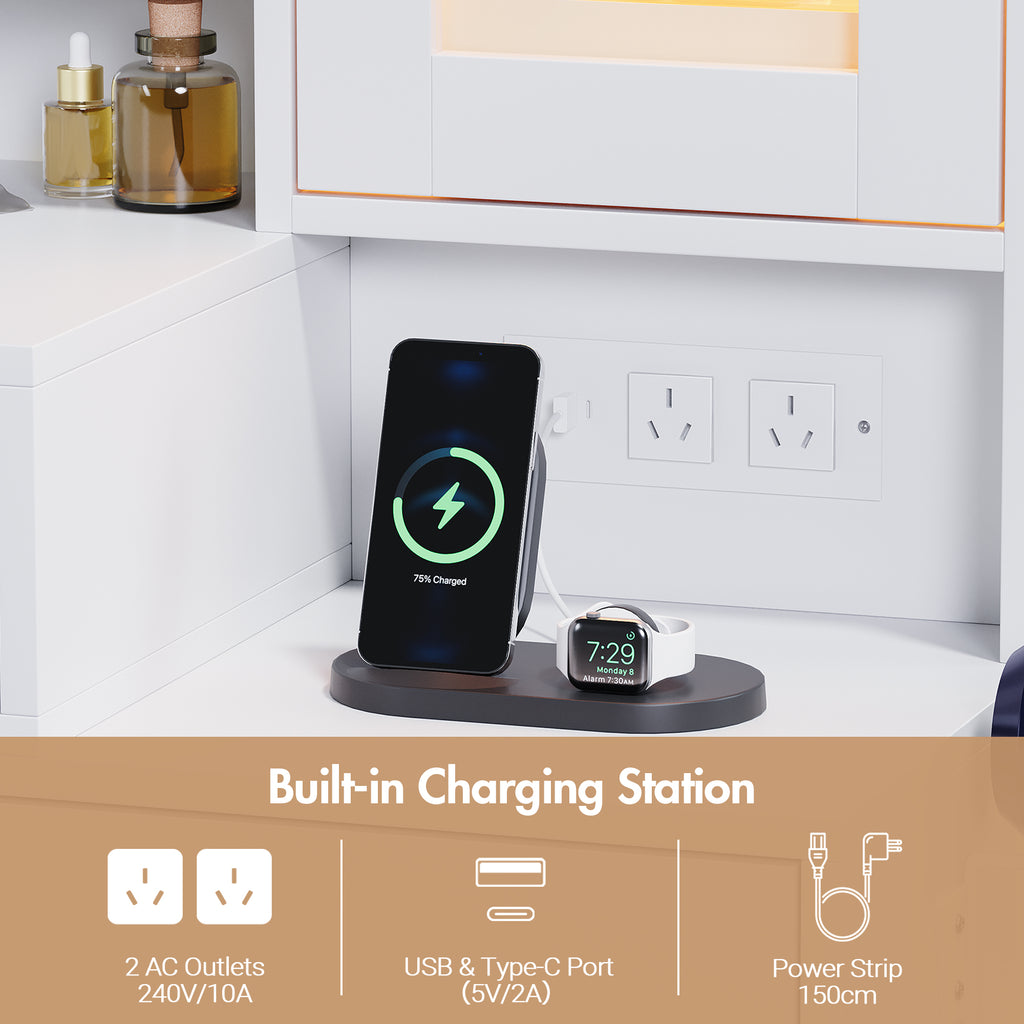 - Built-in Charging Station: The makeup desk includes 2 AC outlets, 1 USB port, and 1 Type-C port to quickly and conveniently plug in your hair dryer, curling iron, or phone without leaving your seat. Keep your devices powered and your beauty space organized.
