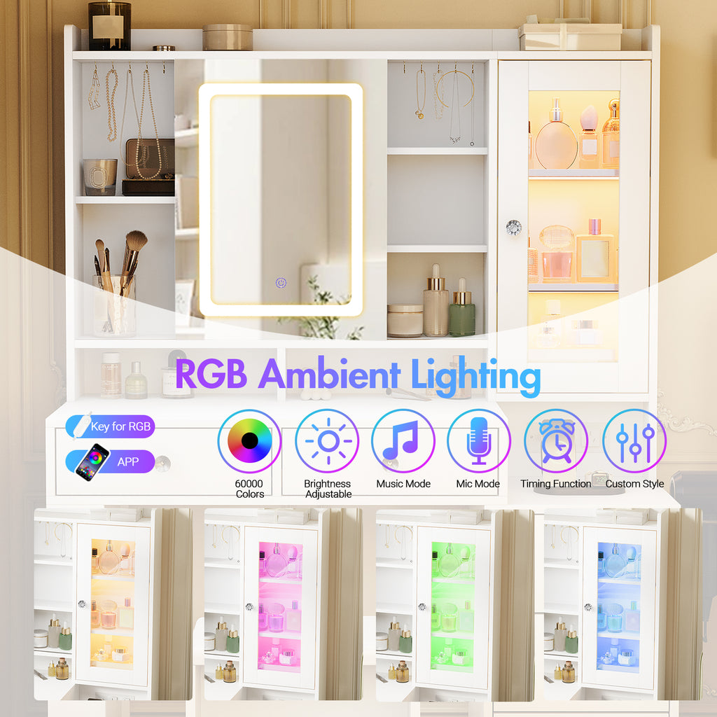 - RGB Lighting Cabinets: This dressing table features smart RGB LED light strip inside the glass cabinet, controllable via button or APP. The lights offer 60,000 colors, multiple lighting effects, and dynamic modes with music-sync function. You can easily customize the color, brightness, and mode through APP to create your ideal atmosphere and enjoy an immersive visual experience.