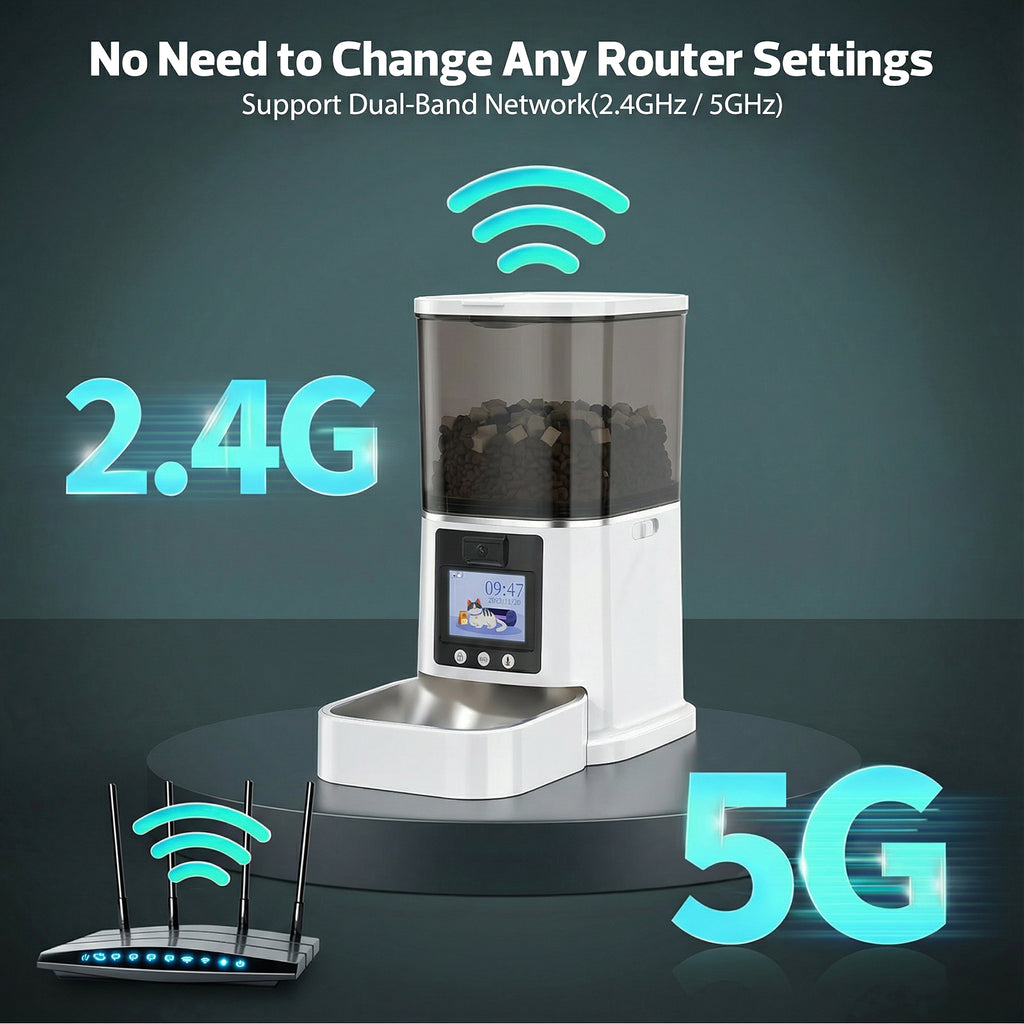 - Smart APP Control: This auto cat feeder supports both 5GHz and 2.4GHz network connections. With the APP, you can schedule up to 10 meals per day with 1-12 portions each, feed your pet remotely, or give them a surprise treat anytime. Whether you’re at work or traveling, this smart automatic cat feeder ensures your pet is fed on schedule. The app also lets you view feeding records, monitor consumption, and share control access with family members—making pet care truly effortless.