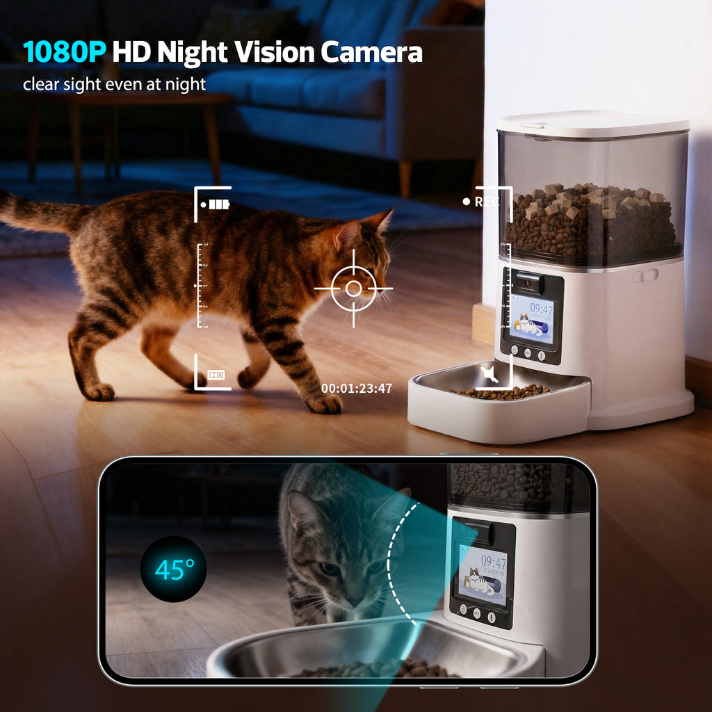The HD camera with 45° tilt control lets you see your pet clearly and even interact in real time using two-way audio. Whether you’re at work or traveling, you can watch, talk, and feed your pet anytime.