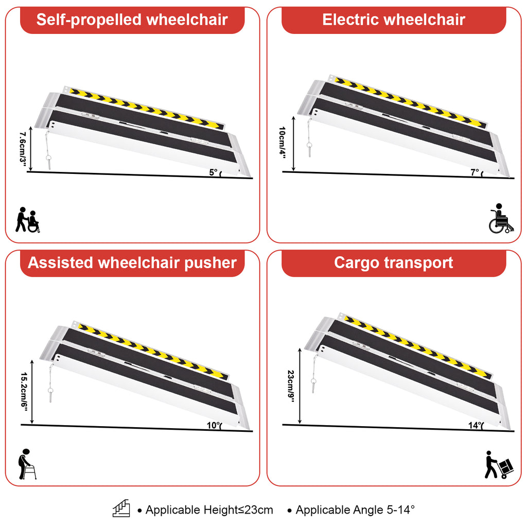 - High Load Capacity and Flexible Angle: The wheelchair ramp is made of high-quality aluminum and features corrosion-resistant stainless steel hinges. It has a maximum load capacity of 270kg. Suitable for steps under 23cm, angle adjustable from 5-14 degrees.