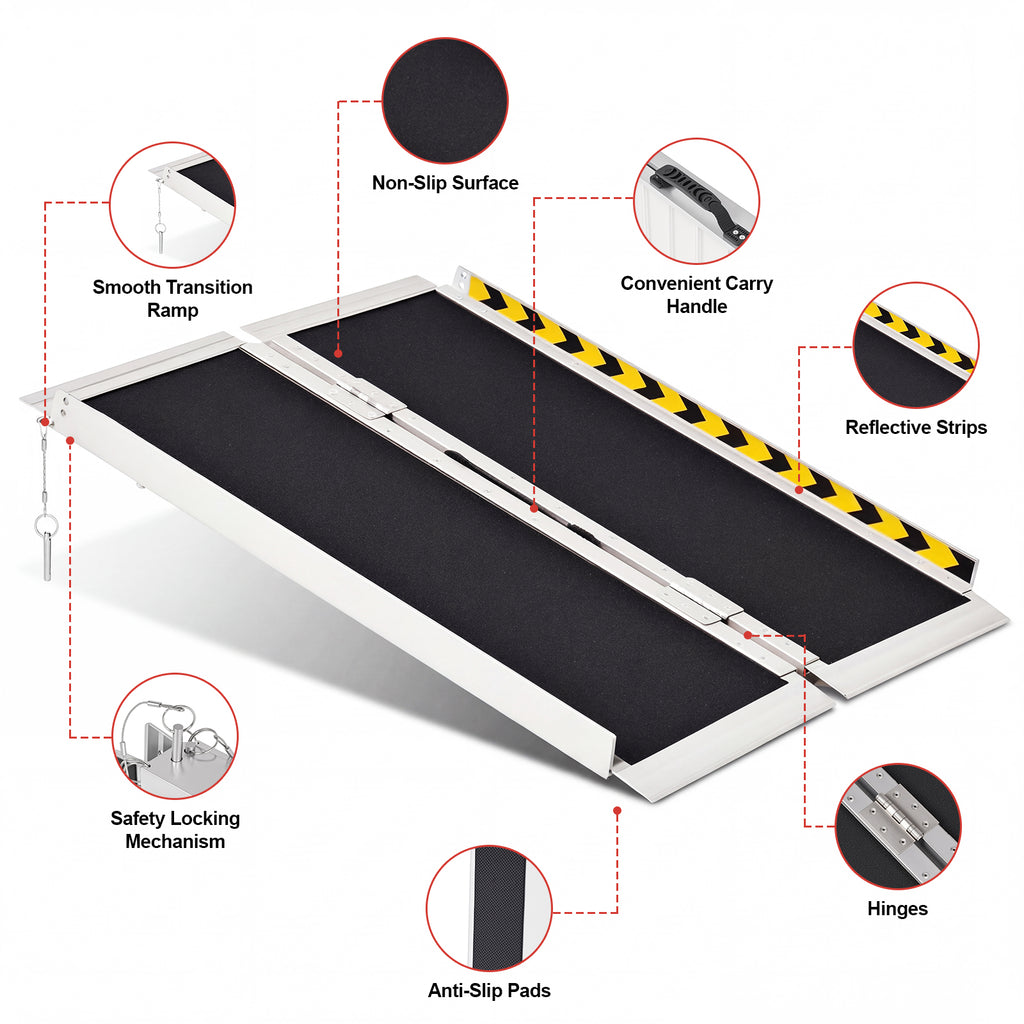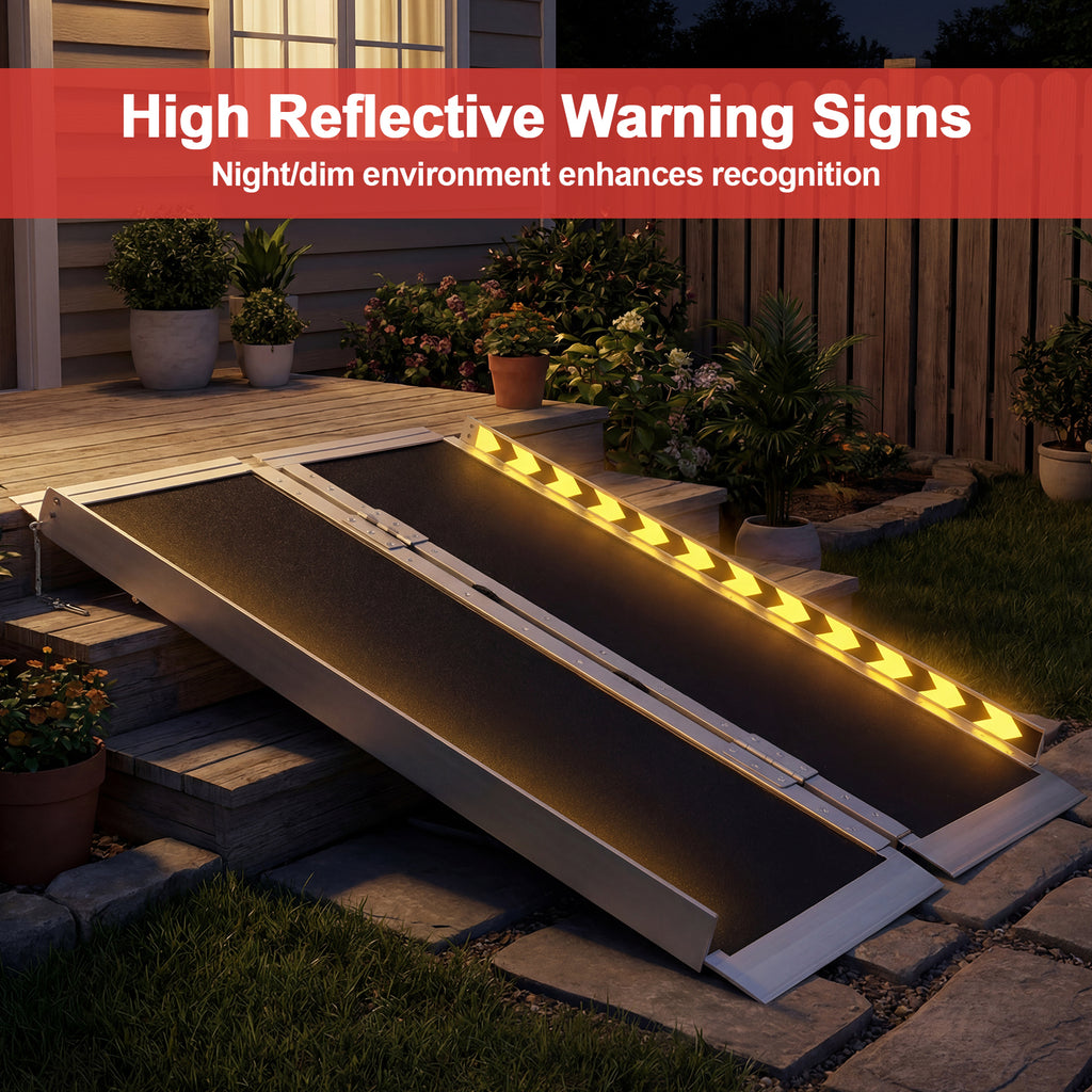 - Safety: The wheel chair ramp is equipped with side guards and reflective stickers to improve visibility and safety, preventing wheels from slipping off the sides and causing accidents. The transition plates at the top and bottom of the ramp ensure a better fit to the ground.