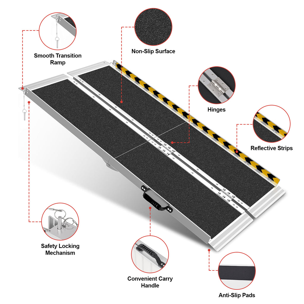 - Safety: The wheel chair ramp is equipped with side guards and reflective stickers to improve visibility and safety, preventing wheels from slipping off the sides and causing accidents. The transition plates at the top and bottom of the ramp ensure a better fit to the ground.