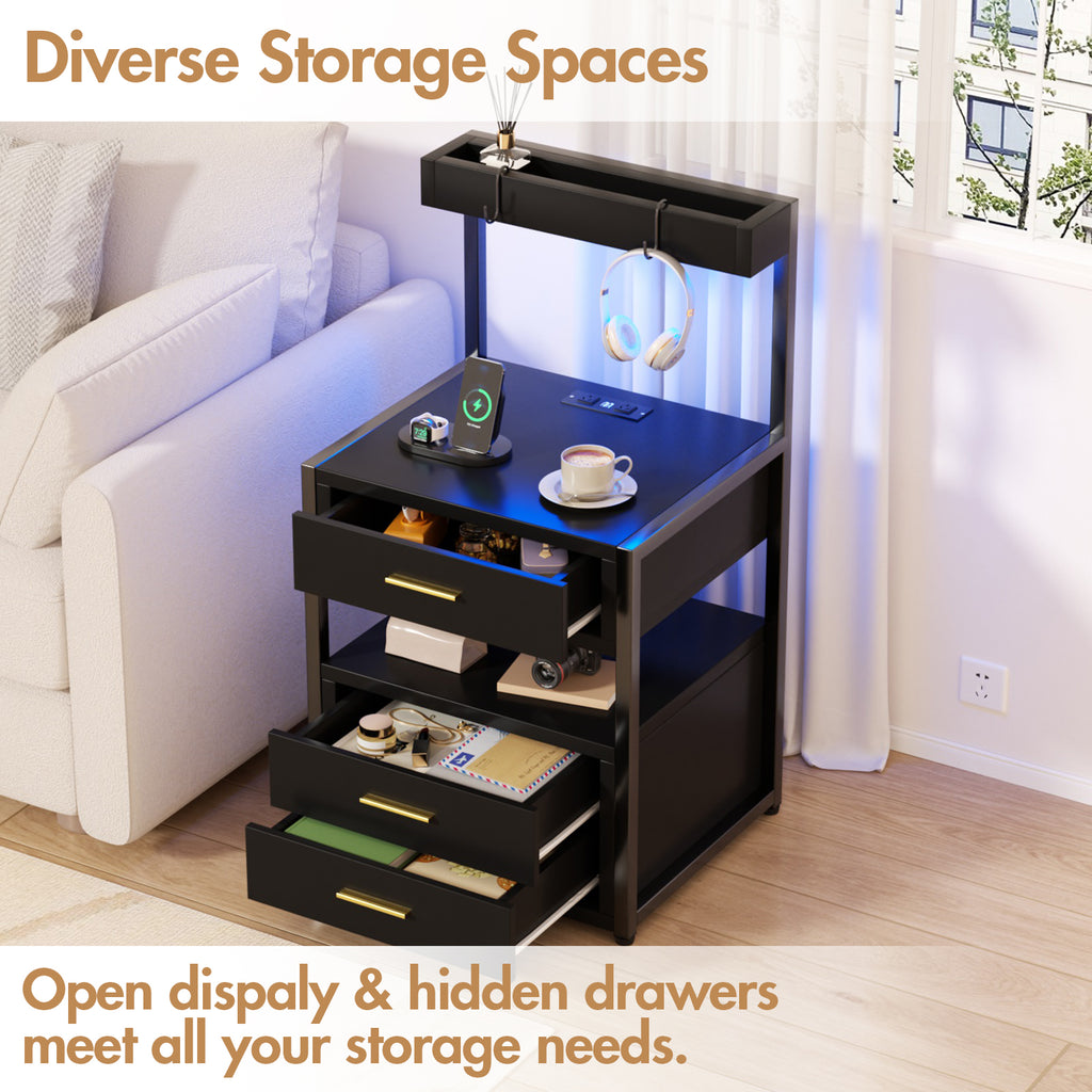 This LED nightstand combines modern lighting, practical charging, and generous storage in one stylish design. Featuring 60,000 RGB colors with adjustable brightness, music sync, timing mode and a built-in mic, it creates a vibrant ambience for any room. The integrated charging station includes 2 AC outlets and 2 USB ports, keeping devices powered within reach while reducing cable clutter. With 3 smooth drawers, 2 open shelves and an extended top, it offers ample space for organised living. Made from durable E1 particleboard with a waterproof finish and metal frame, it is sturdy, easy to maintain, and perfect for bedrooms, living rooms, offices or gaming spaces. Simple instructions and included tools ensure quick assembly, making it a practical and thoughtful gift.