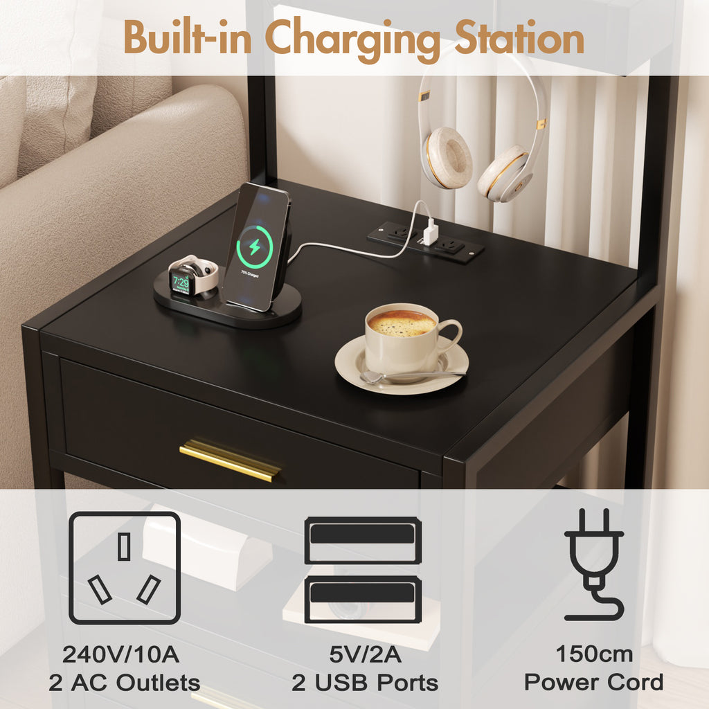 - Built-in Charging Station: The bedside table is arranged with 2 AC outlets, 2 USB ports, allowing you to charge mobile devices like cell phones, pads, lamps, laptops, etc. Easy to use within arm’s reach. And a USB port could applied to connect the LED light strip. This will reduce the clutter of charging wires and improve the convenience of your life.