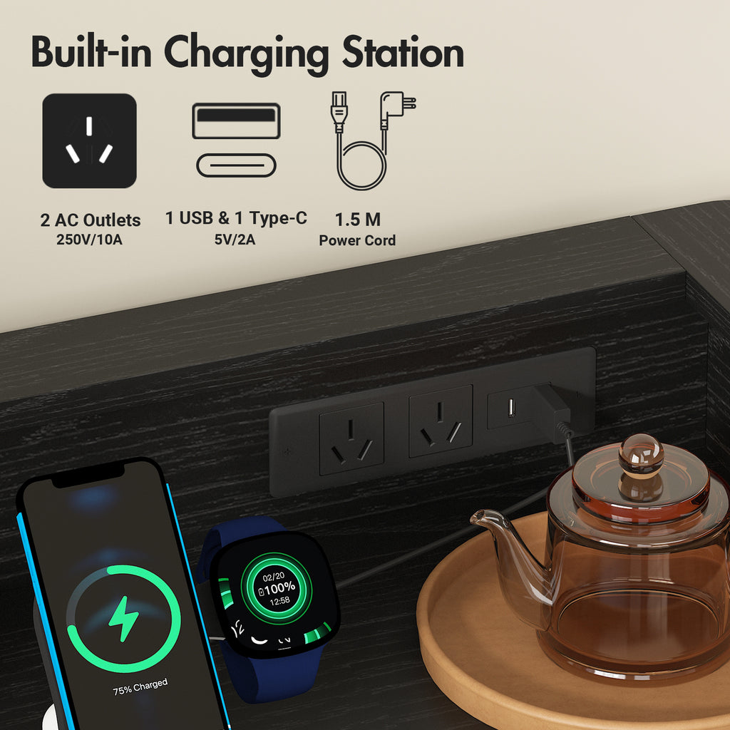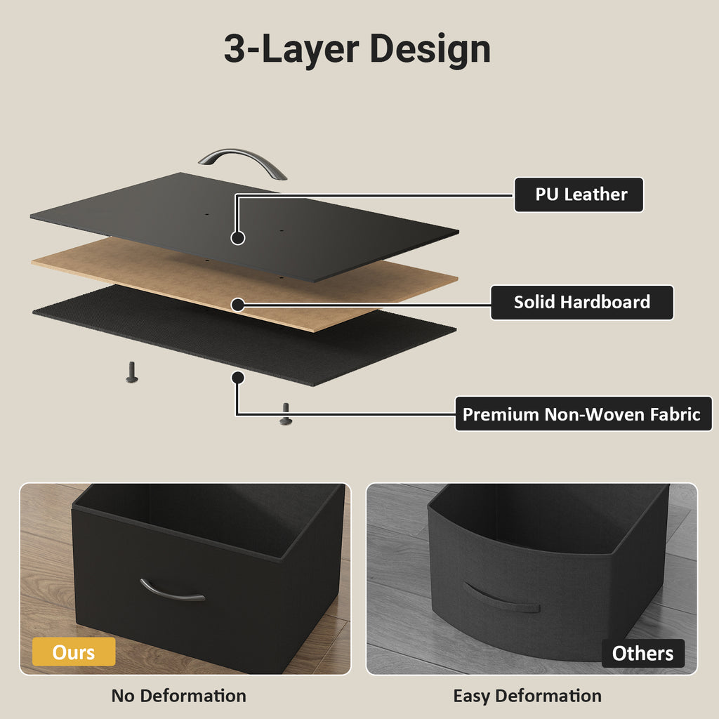 - Charging Station & Smooth Fences: This black dresser features a top shelf with a built-in charging station—including 2 AC outlets, 1 USB port, and 1 Type-C port—for convenient device charging, while its rounded safety edges help prevent drops and keep items securely in place for a neat and organized space.