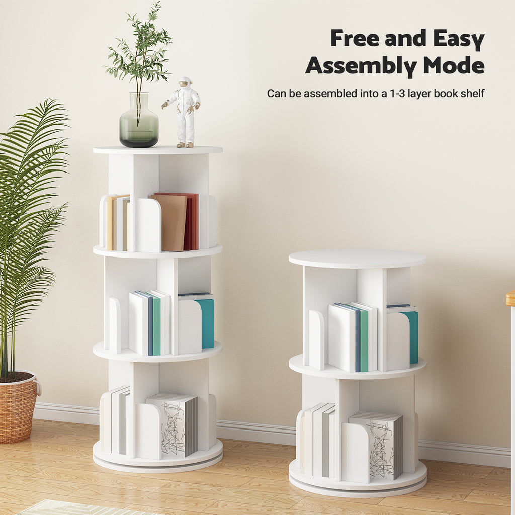 3-tier rotating bookshelf offers smooth 360° access with a sturdy ball-bearing base, making it easy for both kids and adults to reach items from any angle. Its modular design allows flexible assembly into 2 or 3 tiers to fit various spaces, from bedrooms to study corners. Made of premium WPC material, it is waterproof, scratch-resistant, and highly durable for long-term use. The compact round structure provides ample storage without taking up much floor space, while the stable base and rounded edges ensure safety.