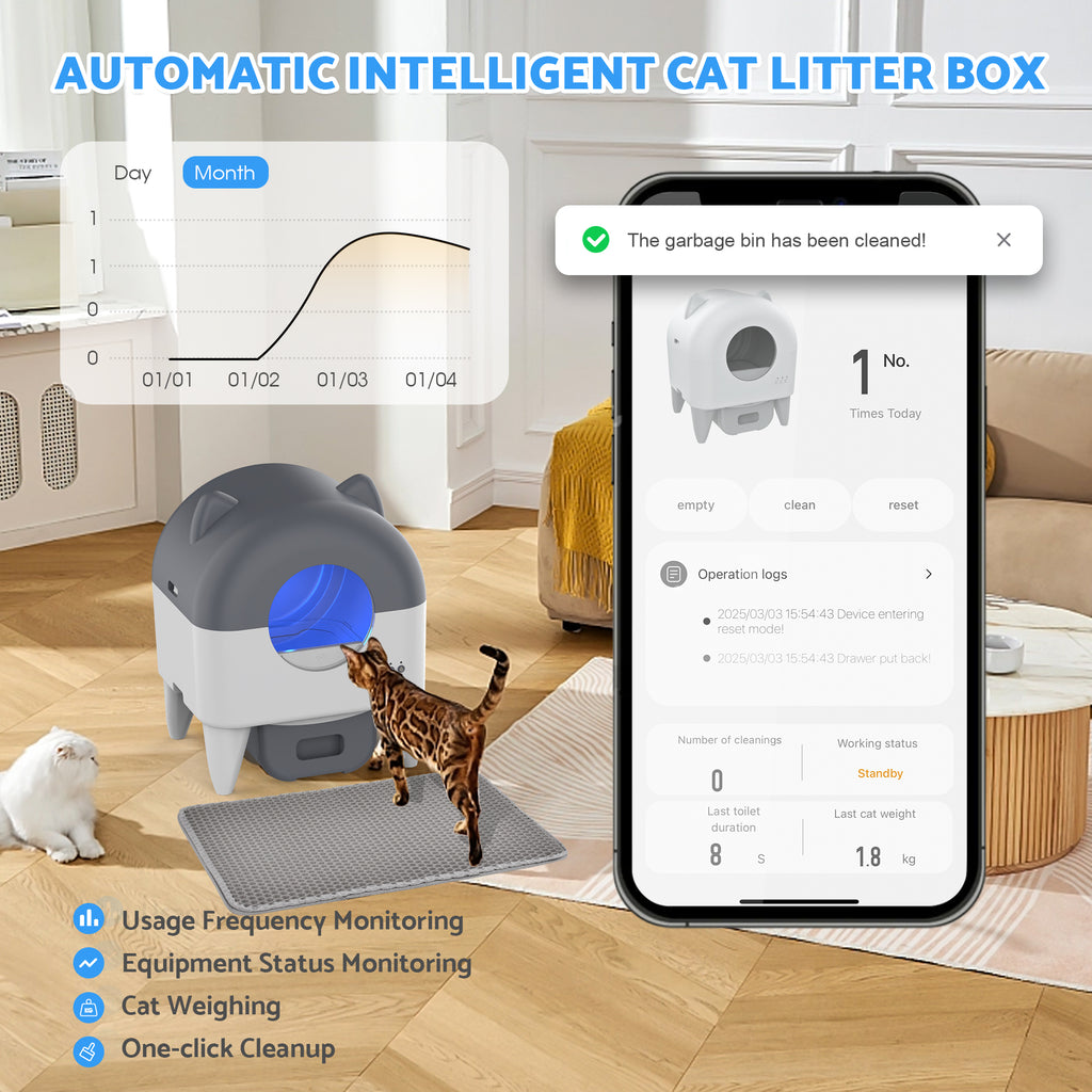 - Smart App Control: Support 2.4GHz Wi-Fi, has 2 cleaning modes: auto-cleaning mode & manual-cleaning mode. Through the “Tuya Smart” APP, the cleaning status of the equipment can be remotely monitored and controlled, Information about your cat’s toilet visits, including frequency, timing, and changes in weight, will be displayed through the app.