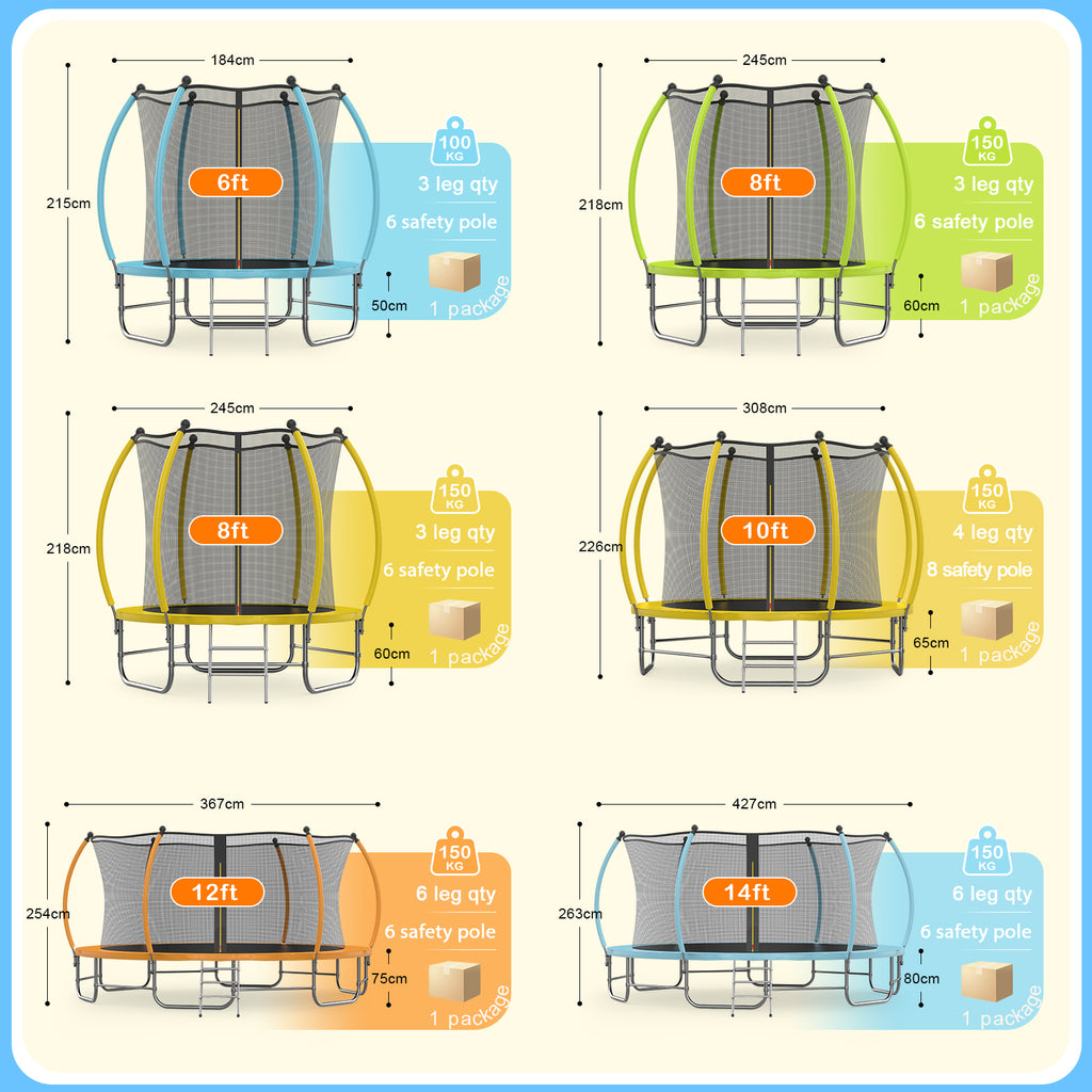 - Thoughtful Details - The 8FT trampoline is equipped with a two-way buckle, which can be easily opened inside and outside, making it convenient for children to enter and exit. It is also equipped with a thickened assembly ladder, which is safe and convenient. The floor area of 245*245cm is very suitable for outdoor or home garden use.