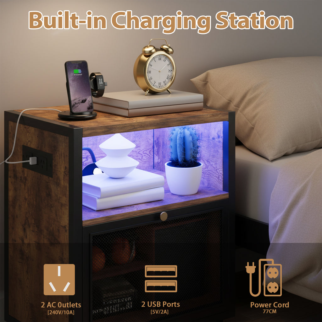 The Advwin LED Bedside Table combines modern functionality with rustic charm for your bedroom or living space. This versatile nightstand features an integrated APP-controlled LED light offering 60,000 RGB colors, multiple dynamic modes, and adjustable brightness to match any mood. Stay connected with the built-in charging station (2 outlets + 2 USB ports), perfect for overnight device charging. Its practical storage includes a flip-down metal mesh drawer and two open shelves, keeping essentials organized yet accessible.