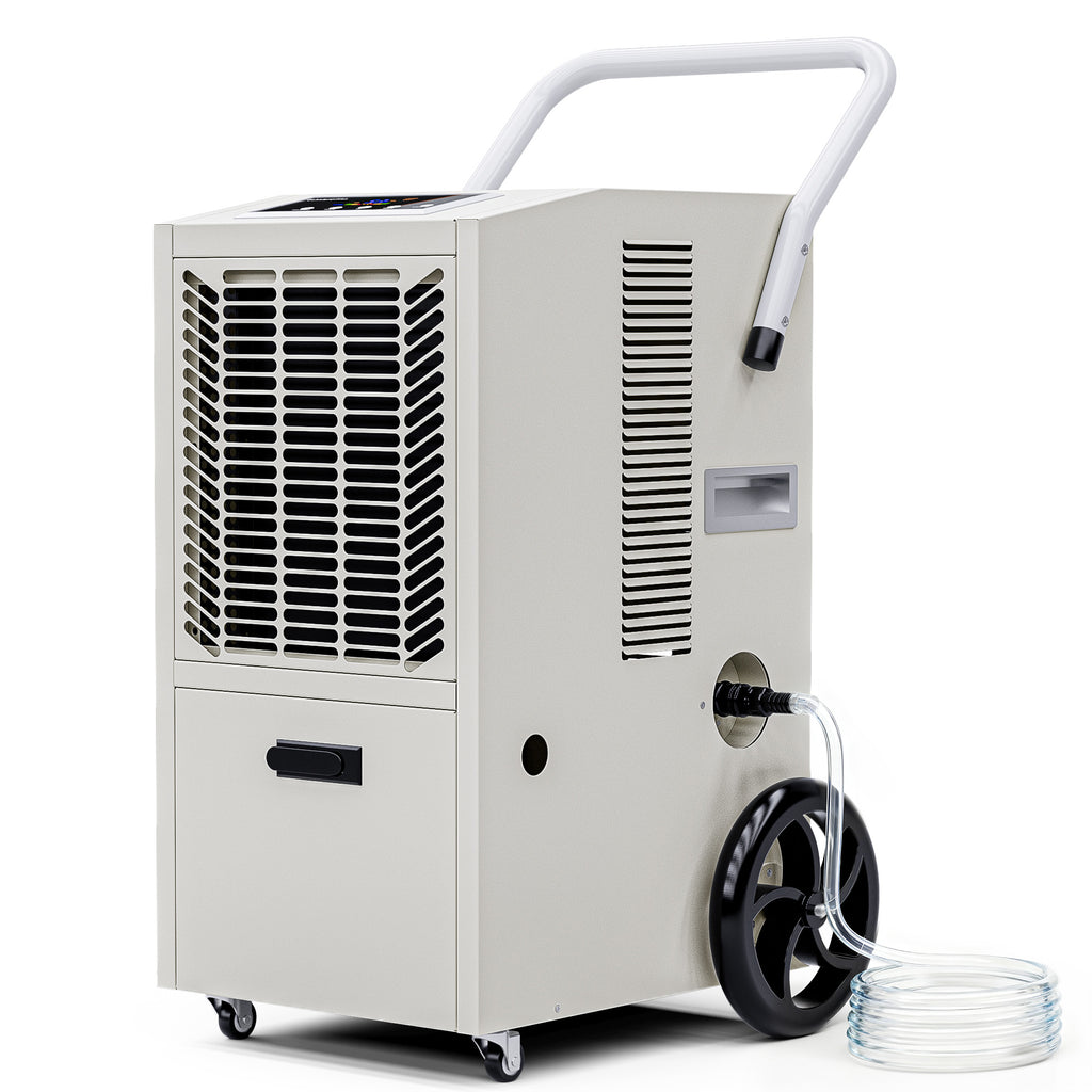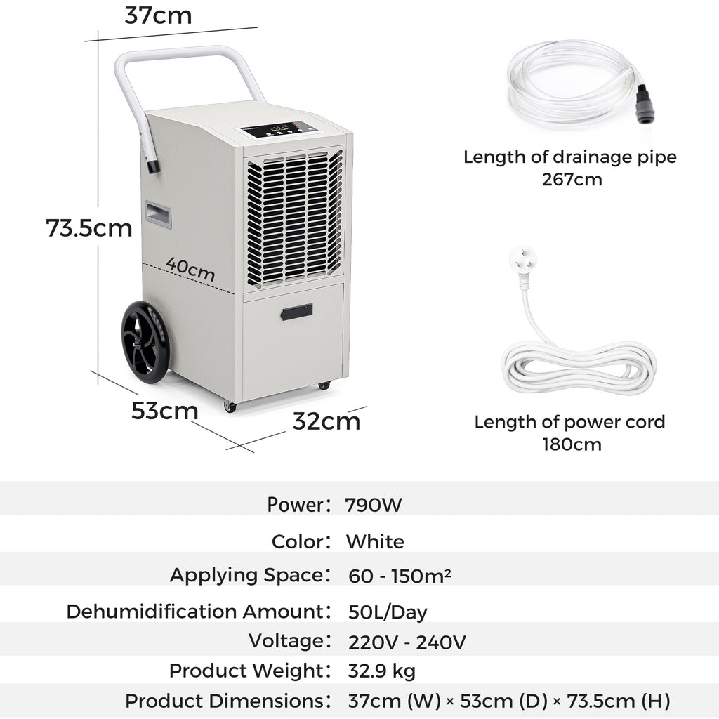 - Powerful 50L/Day Moisture Removal: Equipped with a high-performance compressor, this dehumidifier extracts up to 50L of moisture per day (30℃, 80% RH), making it ideal for large rooms, basements, warehouses, offices, and other commercial spaces.