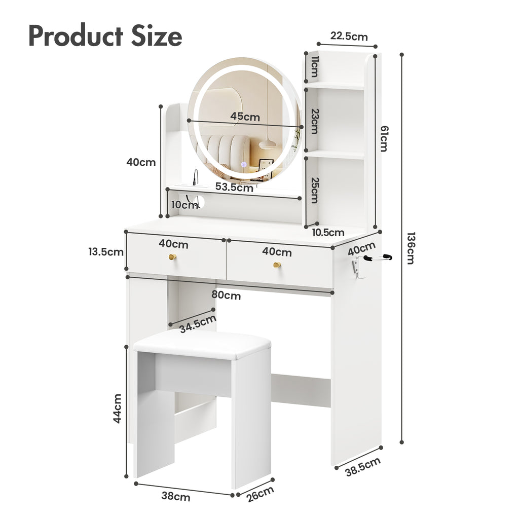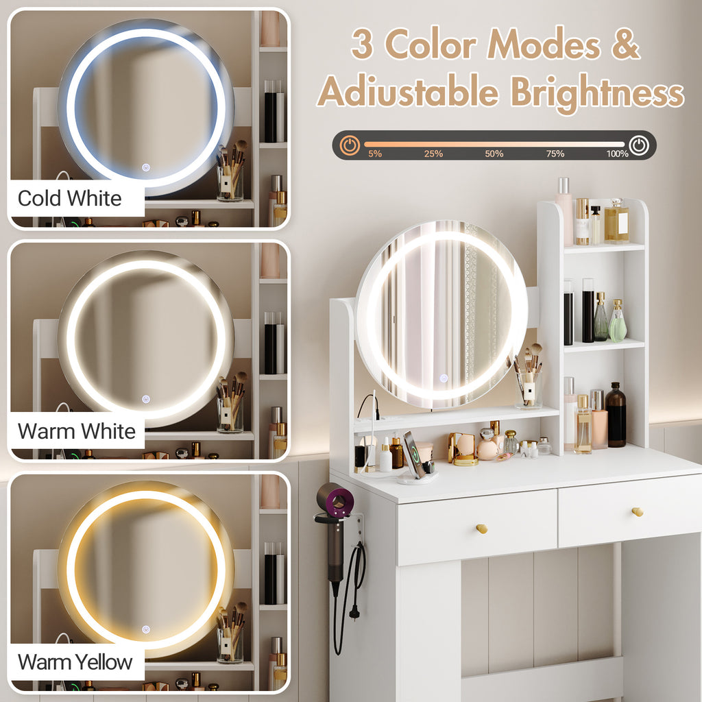 The compact dressing table features a round LED mirror with 3 adjustable color modes for flawless lighting. Designed with open shelves, a spacious tabletop, 2 drawers, a hair dryer rack, and side storage shelves, this multifunctional vanity provides ample space for cosmetics and accessories. The convertible side storage shelves can be installed on either the left or right to suit your room layout.