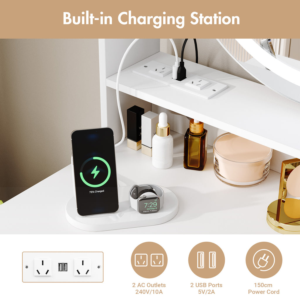 - Built-in Charging Station: The makeup table comes with convenient charging station featuring 2 AC outlets and 2 USB ports. Effortlessly charge your beauty tools, hairdryer, phone, or tablet while getting ready—keeping everything powered, organized, and within easy reach.