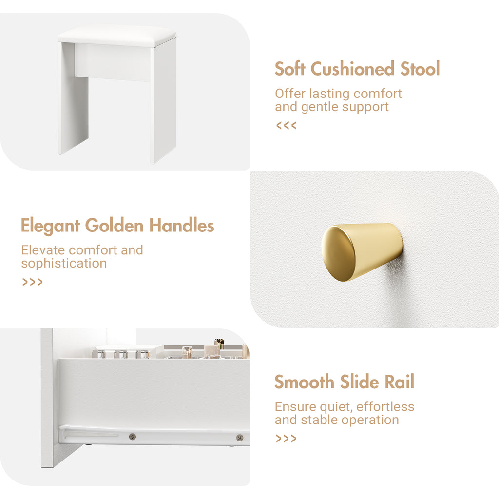 - Ideal Gift for Your Loved One: The elegant vanity table features fashionable gold handles and soft cushioned stool, adding a touch of stylish charm to any room. It makes a thoughtful gift for your mother, daughter, or girlfriend on birthdays, Christmas, Halloween, Thanksgiving or special anniversaries.