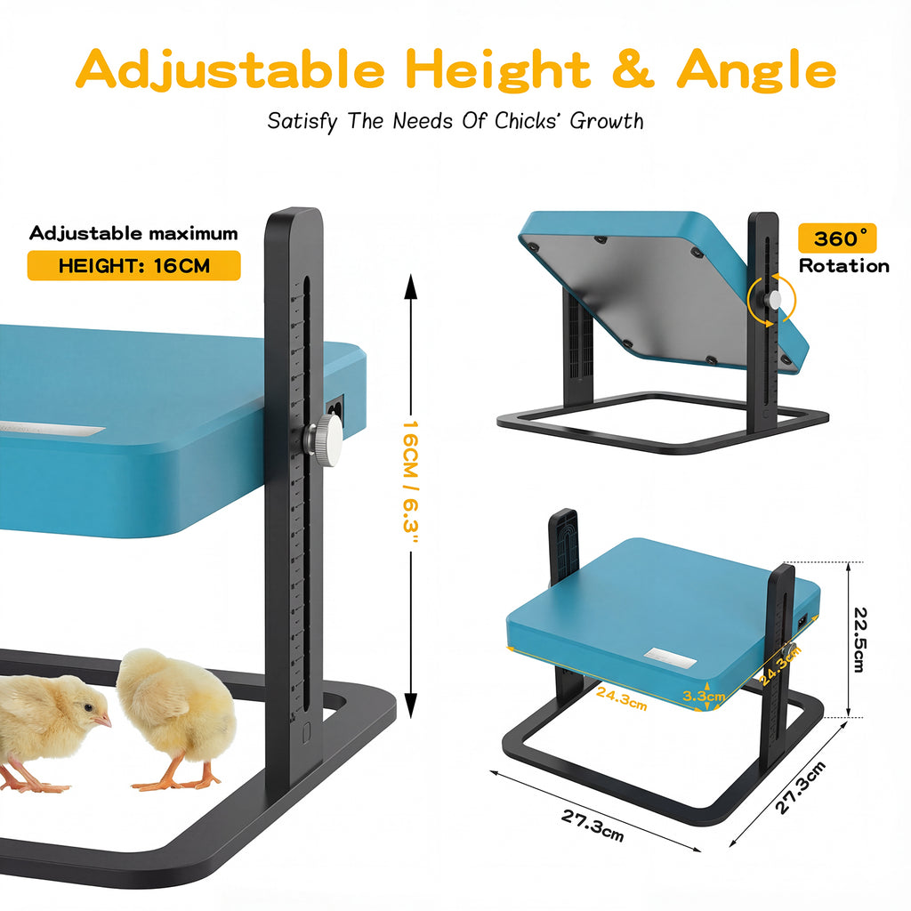 - Ideal Size for Your Flock: 27×27CM chicken brooder heater plate fits up to 10 to 20 newly hatched chicks, ducklings, goslings, and other domestic fowl; Adjust the height to make sure direct contact with the bottom of the chick brooder plate.