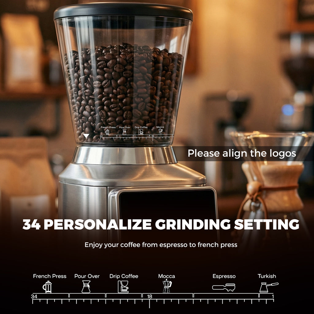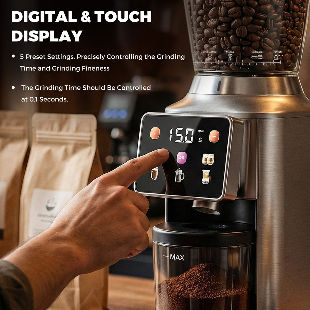 With 34 grind settings, you can easily switch between coarse, medium, and fine textures to suit every brewing method. The anti-static design keeps your counter clean, and the digital touch control panel provides accurate timing and intuitive operation.