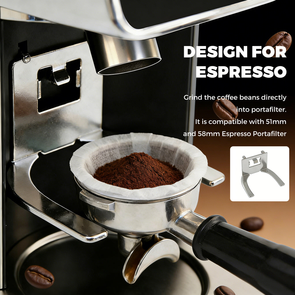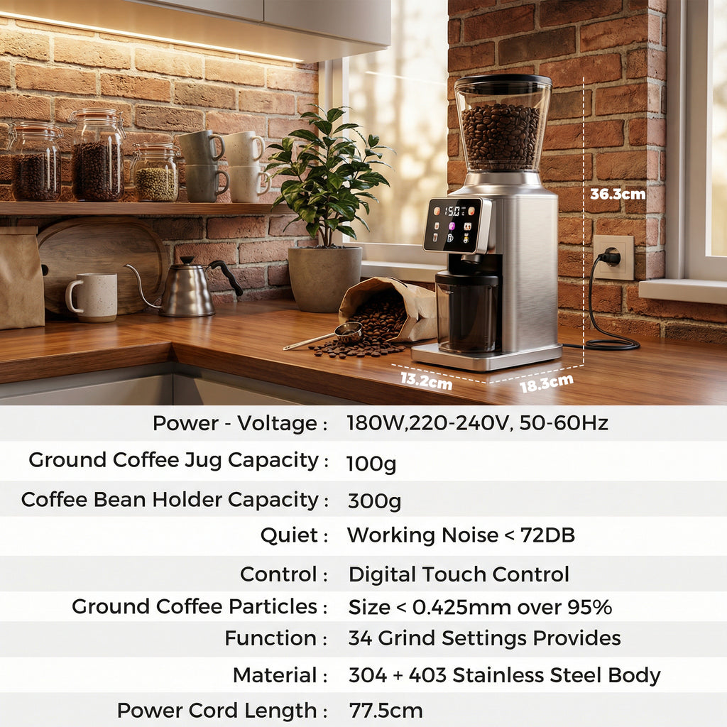 The LED digital touch interface lets you precisely set grinding time and monitor progress in real-time. Includes a 300g bean hopper, 100g ground coffee container, and stainless steel portafilter holder. Built with a durable stainless steel housing for modern kitchens and professional coffee stations.
