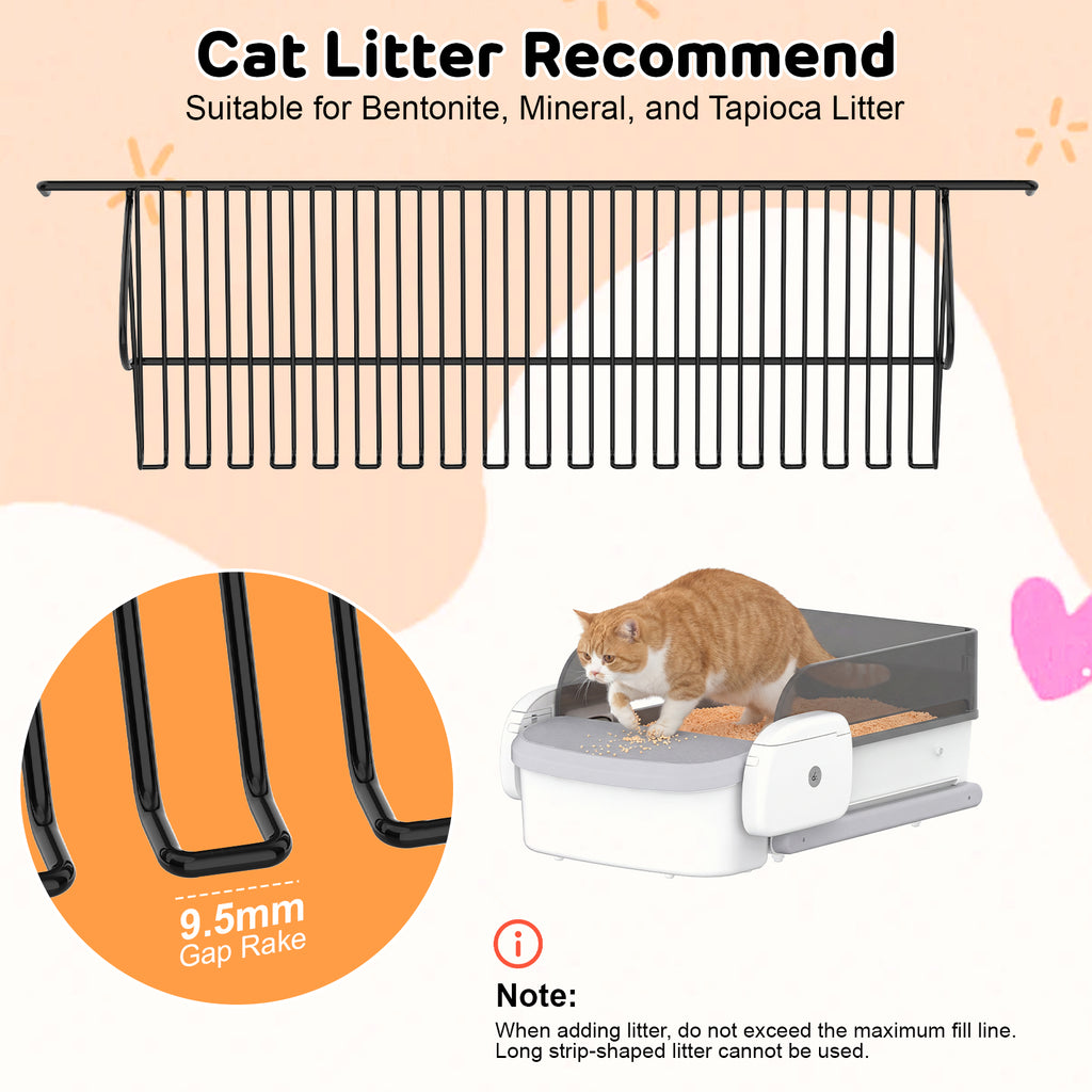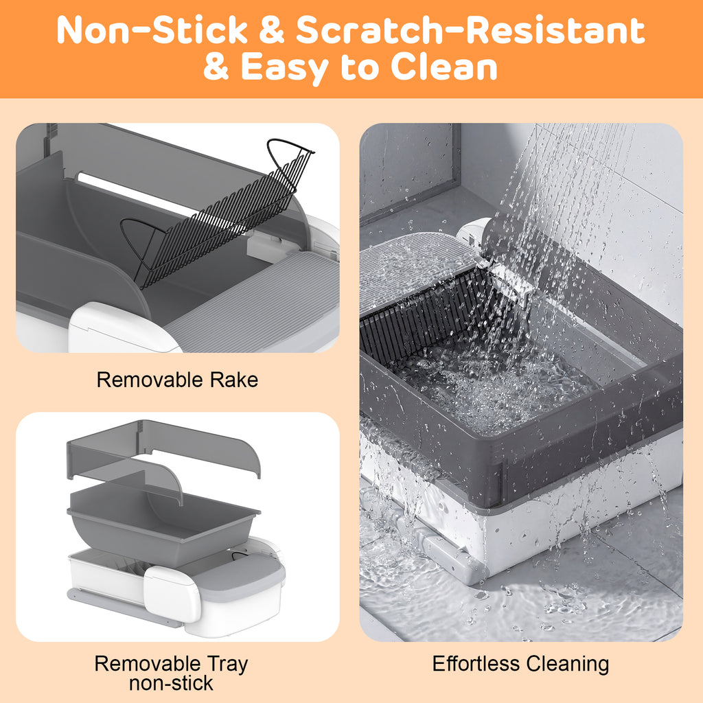 - Much Easier to Clean and Maintain: Unlike the one-piece design of rolling style self-cleaning litter boxes that’s time-consuming and laborious to clean, the self scooping litter box features a detachable structure. The parts that come into direct contact with waste – the litter pan and rake – are all detachable for quick and easy cleaning.