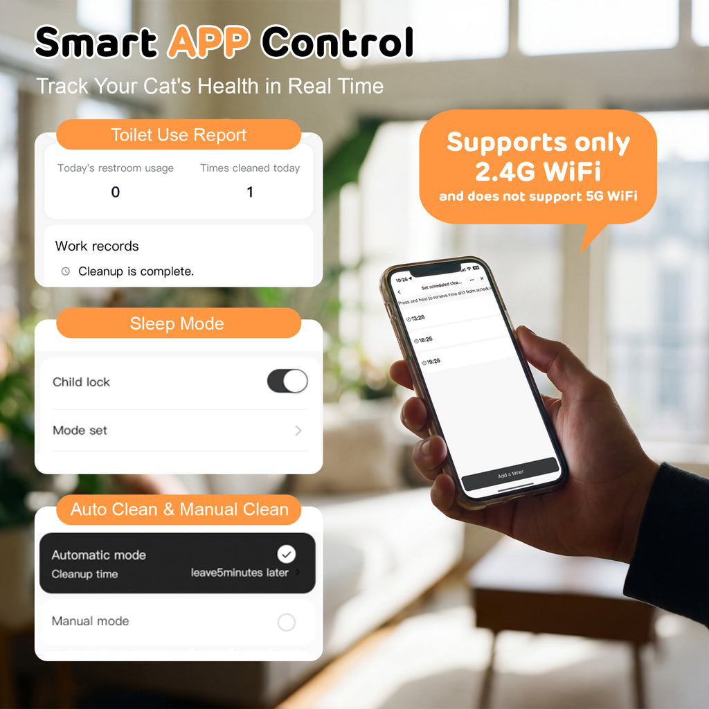 - Smart App Control: Manage the automatic litter box self cleaning system through the app. You can start cleaning with one tap, schedule timed cycles, set sleep mode, and monitor your cat’s toilet frequency and duration. A truly smart cat litter box that makes pet care effortless and intelligent.