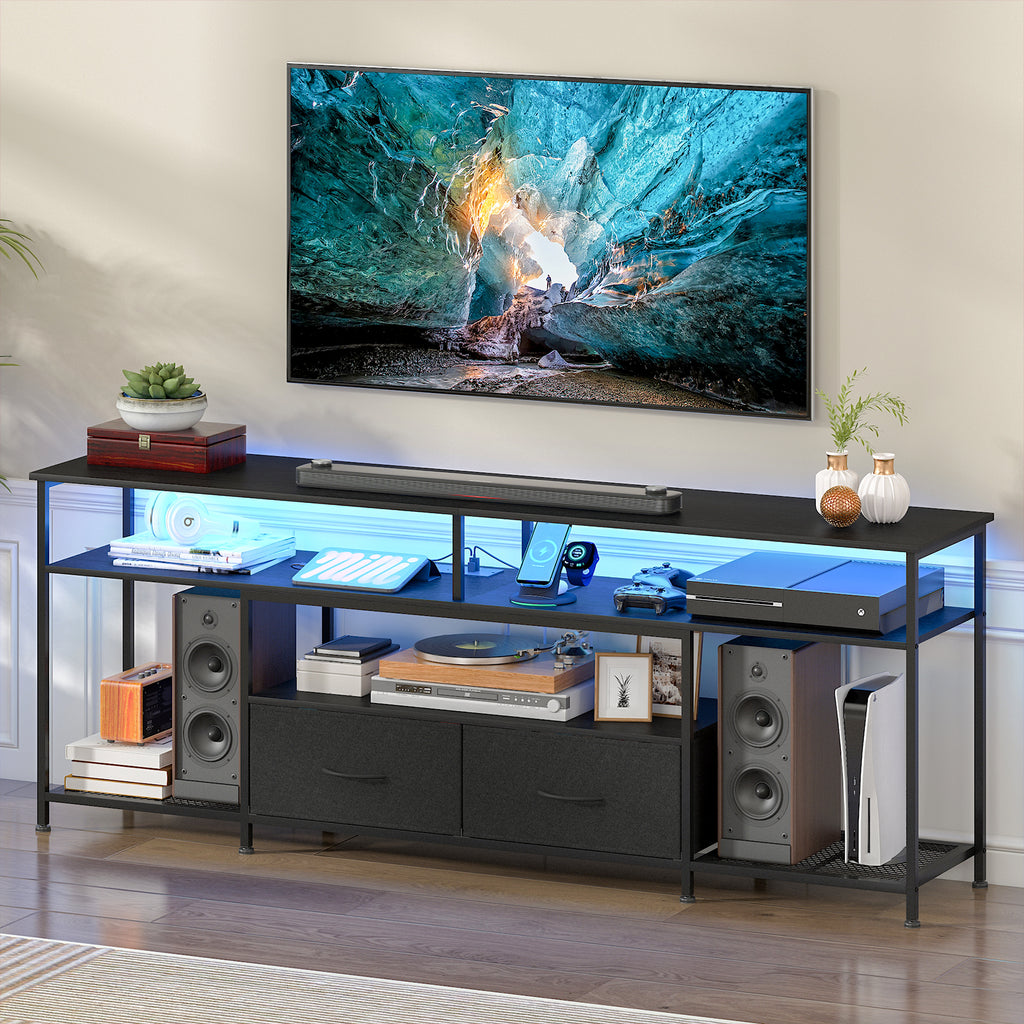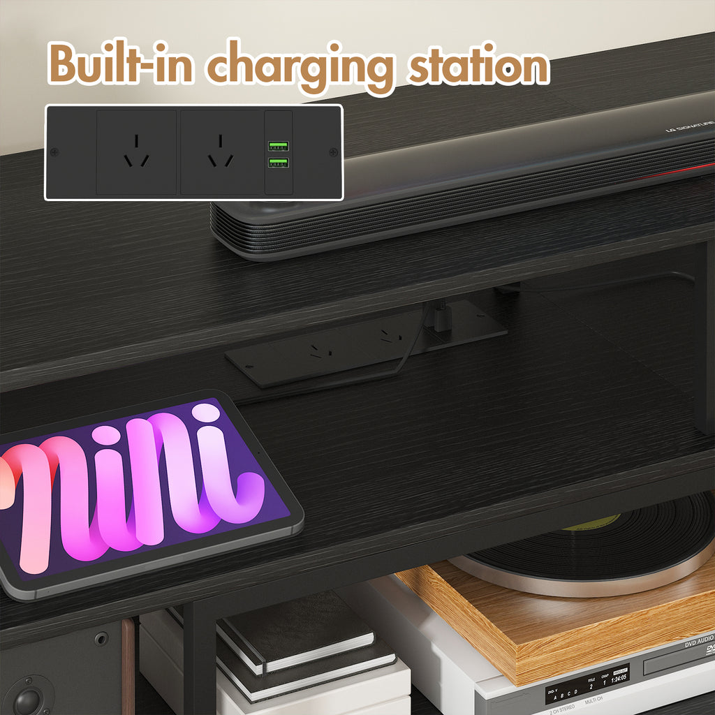 This versatile TV stand transforms your space into an entertainment center. It features dynamic RGB LED lights that sync to music, a built-in charging station with AC and USB ports, and optimized open storage for all your media devices. Designed with a sturdy, stable construction and anti-tip safety, it combines style, functionality, and an enhanced viewing experience for any room.